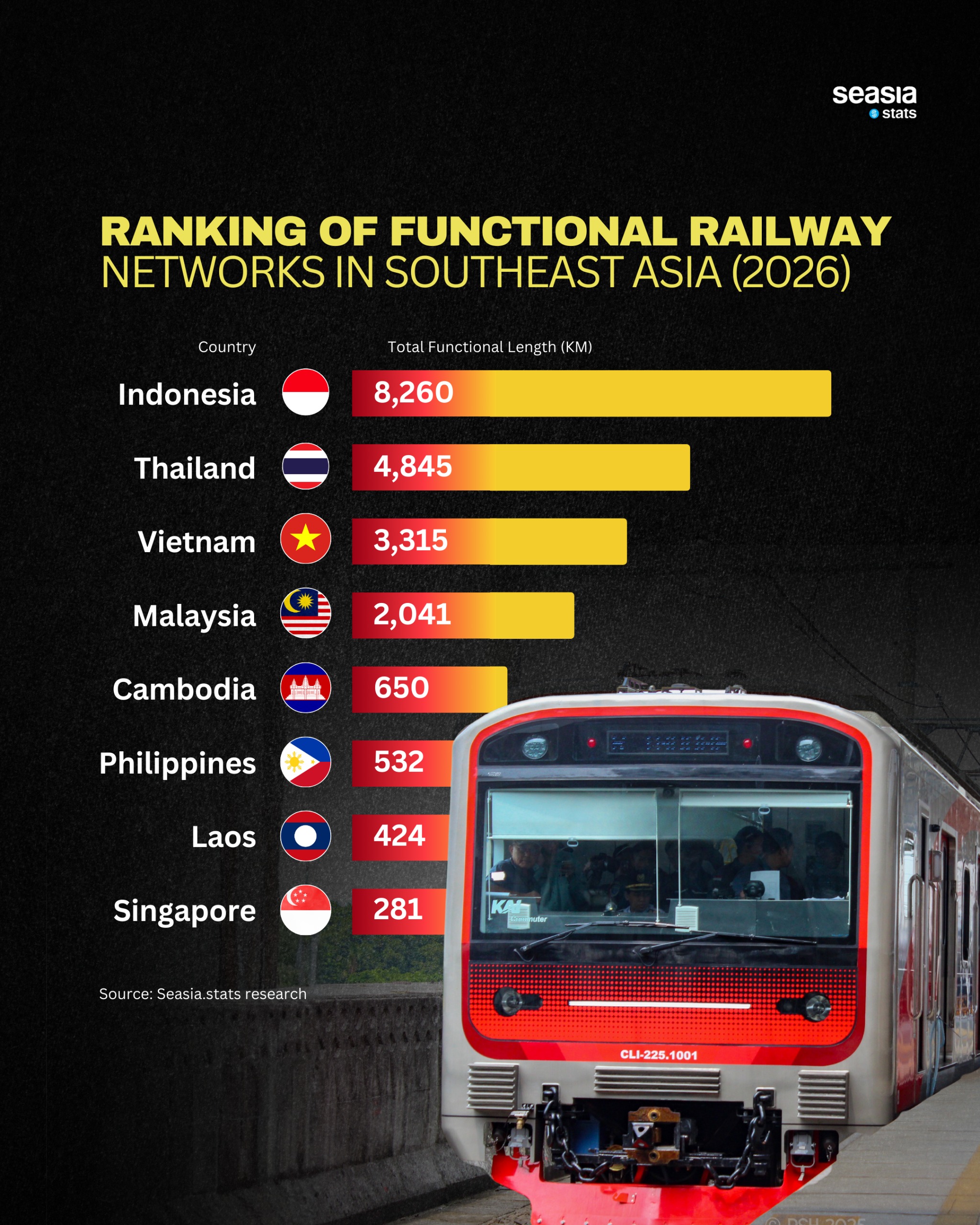 According to Seasia Stats research, Indonesia now leads Southeast Asia with an impressive 8,260 kilometers of functional railway lines. This expansive network stretches across major islands such as Java and Sumatra, serving both commuter and freight needs.