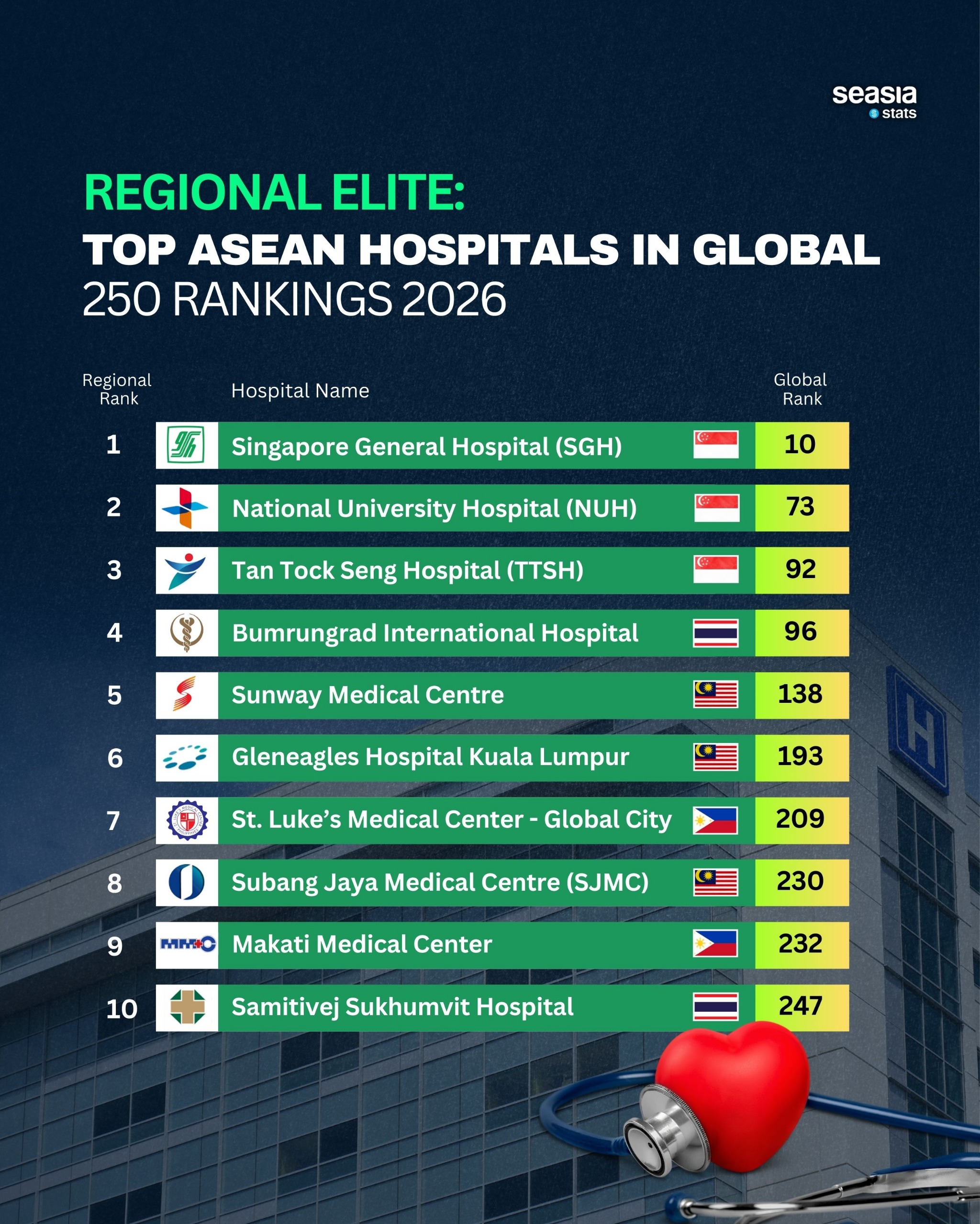 Malaysia appears once more in the list with Subang Jaya Medical Centre (SJMC) at 230th globally, while Thailand completes the top ten with Samitivej Sukhumvit Hospital, ranked 247th globally.