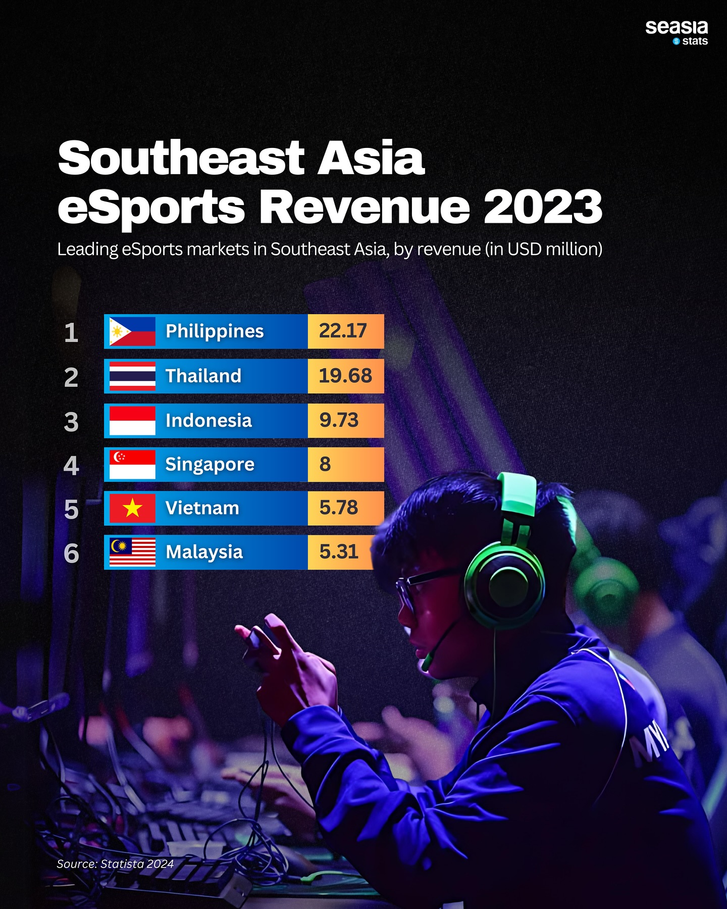 Stats from the Statista Research Department show that the Philippines leads the eSports market in the region with revenue $22.17 million USD, followed closely by Thailand with $19.68 million USD.