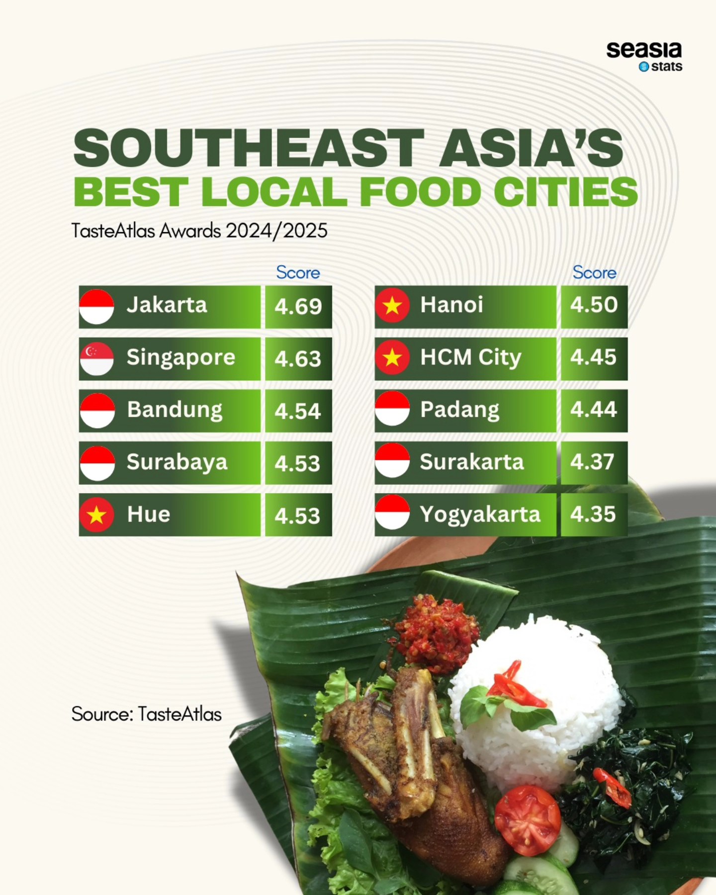 These scores place Indonesian cities alongside or above regional culinary powerhouses such as Singapore (4.64) and Vietnamese cities like Hue (4.53), Hanoi (4.50), and Ho Chi Minh City (4.45). This highlights Indonesia's rich culinary traditions and its ability to compete on an international stage.