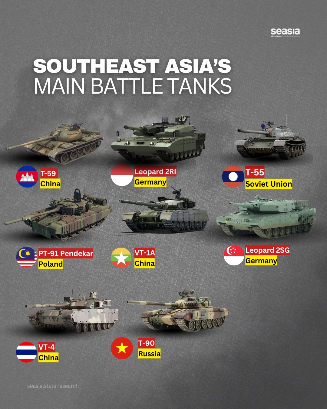 Data highlighted by Seasia Stats shows that Southeast Asian armies rely on a remarkably diverse range of tank platforms sourced from Europe, China, and Russia, reflecting the region’s varied defense partnerships and procurement strategies. From advanced German-designed tanks to Soviet-era armor still in service, the region’s armored fleets reveal a complex blend of modernization and legacy equipment.