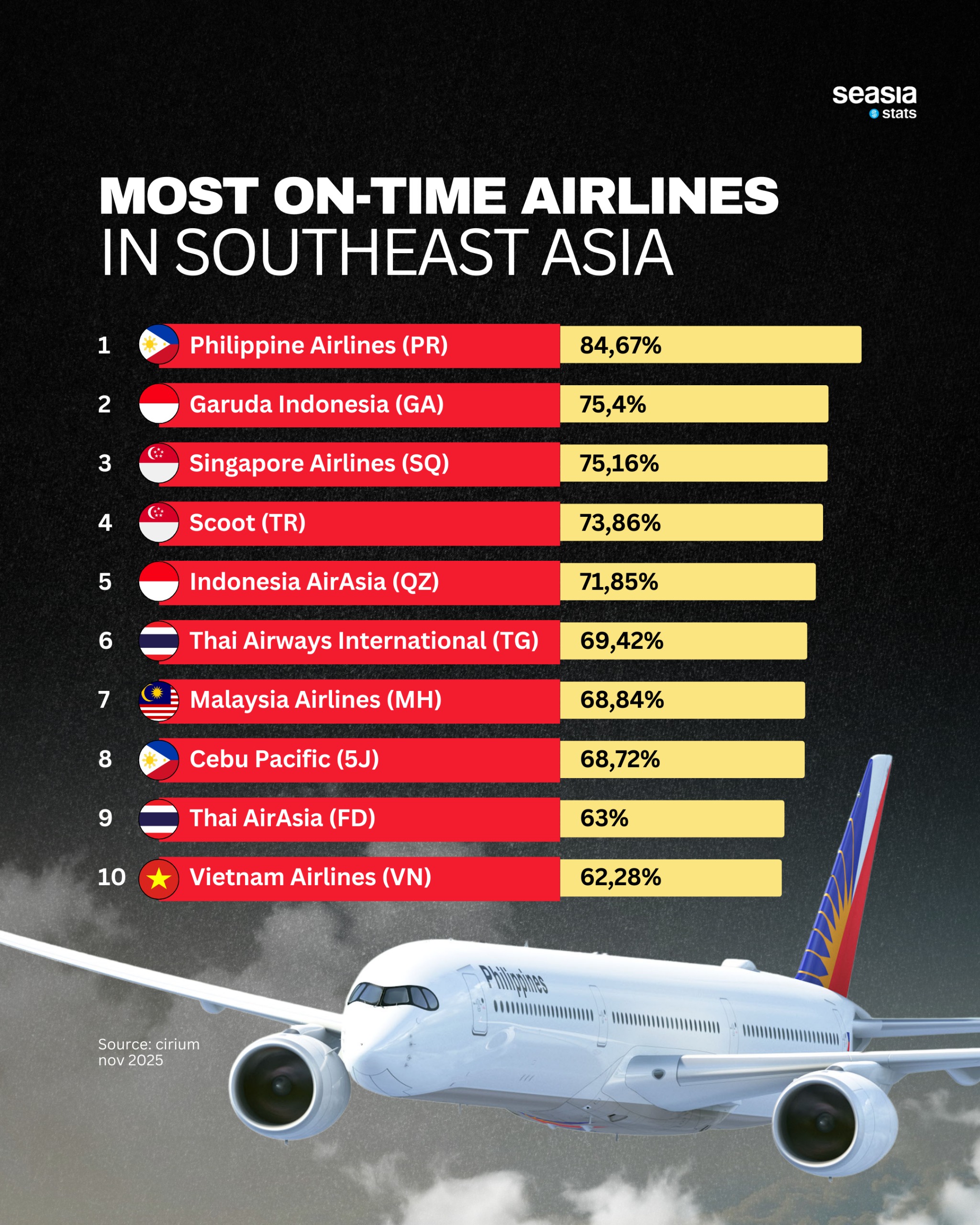 At the top of the rankings is Philippine Airlines (PAL), which has firmly established itself as Southeast Asia’s most punctual carrier. In 2025, PAL recorded an on-time arrival rate of 83.12%, earning the title of most on-time airline in the Asia-Pacific region from Cirium.