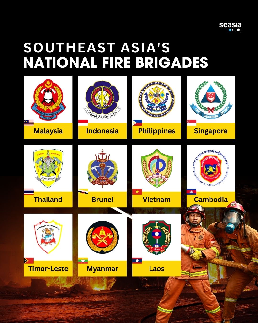 This visual snapshot brings together the official insignias of the 11 national fire brigades across Southeast Asia, offering a rare look at how each country symbolizes its firefighting force.