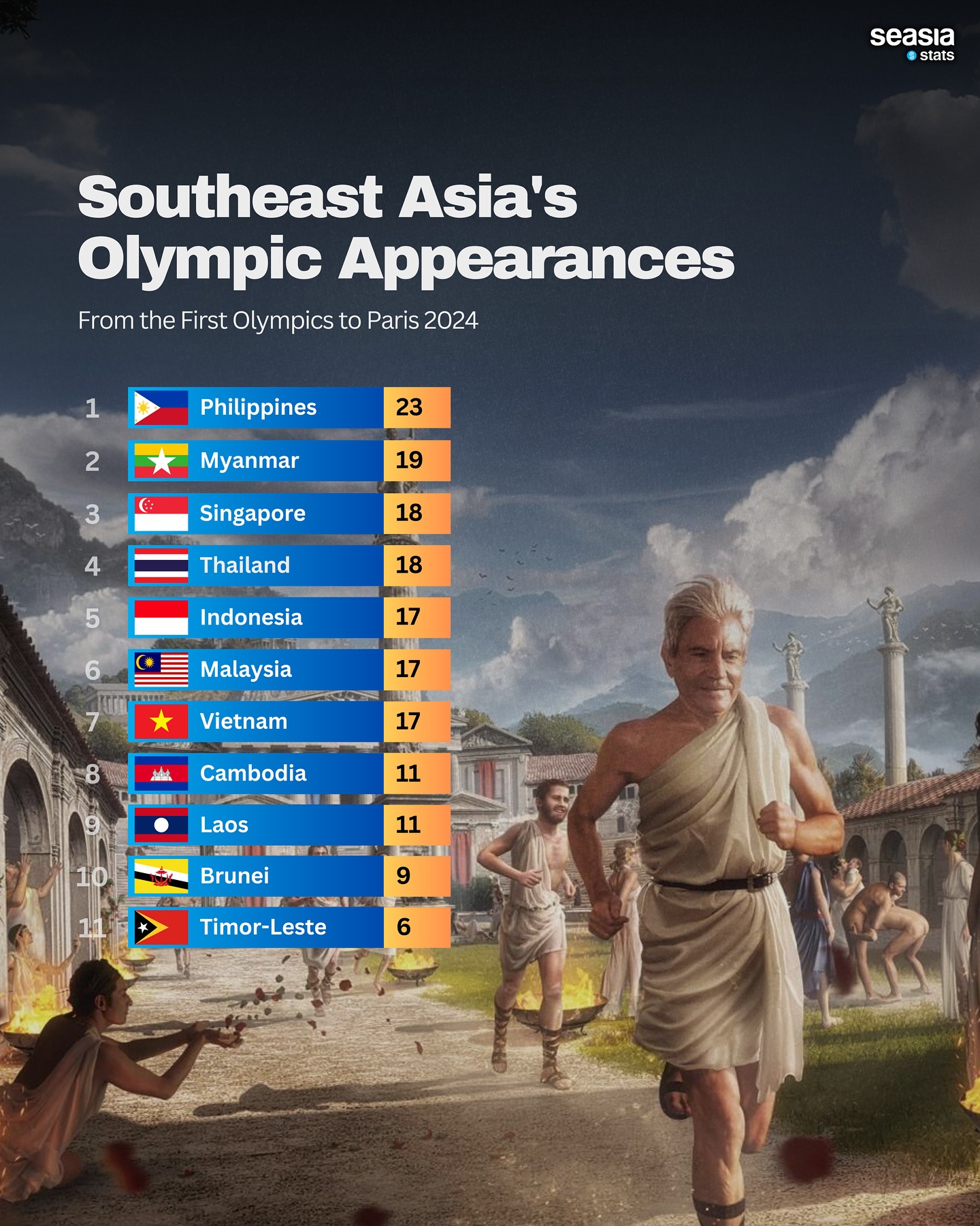 Philippines - The Philippines leads Southeast Asia in Olympic appearances, having participated 23 times up to Paris 2024. The country's commitment to the Olympics is evident in its long history and consistent presence in the Games.