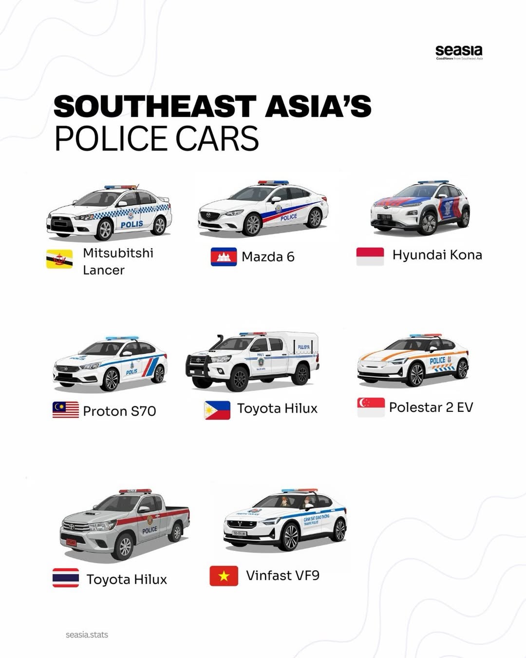 Police fleets across Southeast Asia reflect the region’s diverse geography and policing needs, ranging from dense urban centers to rugged rural terrain. At the top of the list is the Toyota Hilux, widely used by police forces in countries such as the Philippines and Thailand. Its durability, off-road capability, and reliability make it the go-to choice for patrols in challenging environments, border areas, and rapid-response operations.