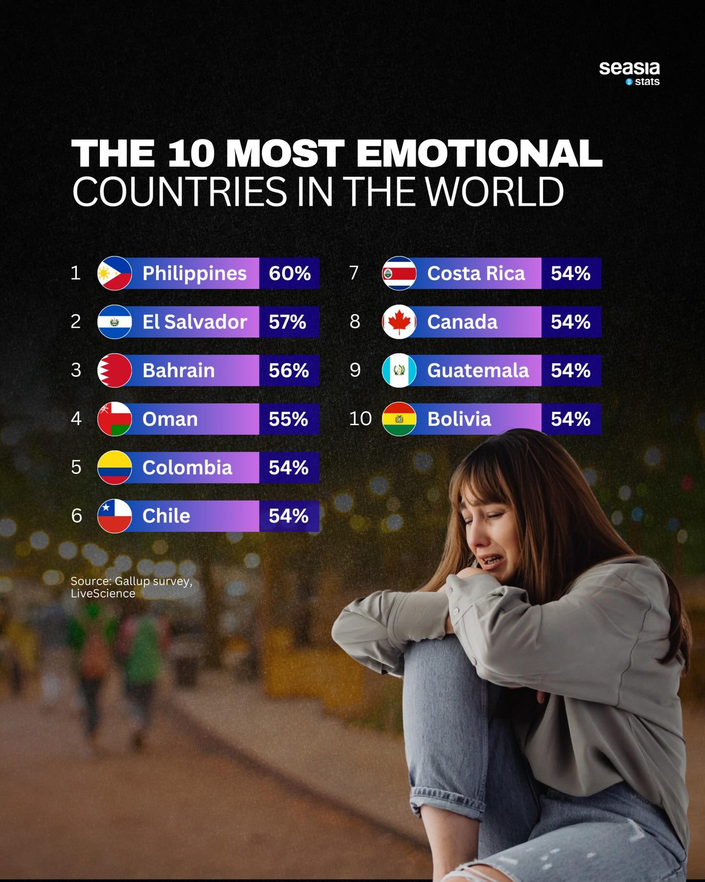The latest Gallup survey highlights the world’s most emotional countries, revealing the Philippines at the top with 60%, followed by El Salvador and Bahrain. These rankings reflect nations where people report experiencing a high intensity of daily emotions—both positive and negative. From joy to stress, these emotional responses provide insight into how social, cultural, and economic factors shape everyday life across regions.