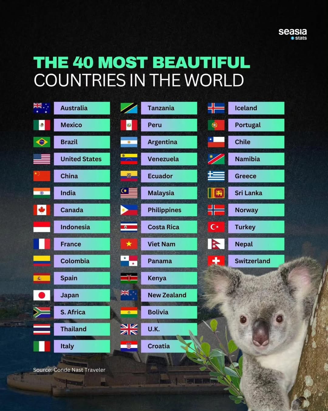 The list also includes countries known for their wildlife, such as Tanzania and Kenya, as well as those with unique cultural experiences, like India and Japan. From the bustling streets of China to the serene landscapes of New Zealand, the 40 countries offer a glimpse into the diverse beauty of our world.
