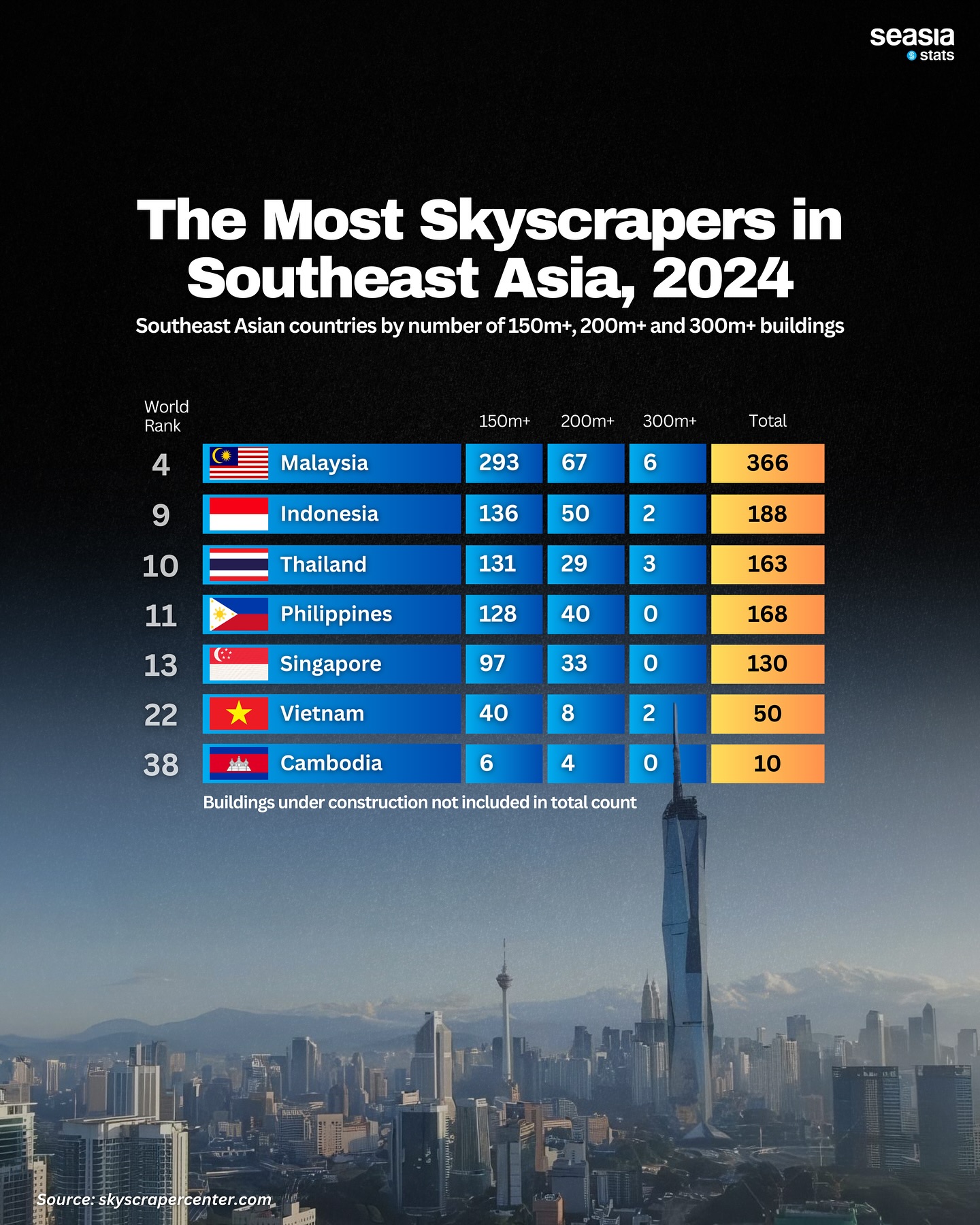 Indonesia follows closely, holding the ninth global rank with 188 buildings. Meanwhile, Thailand secures third place in Southeast Asia and tenth globally, with a total of 163 impressive structures.
