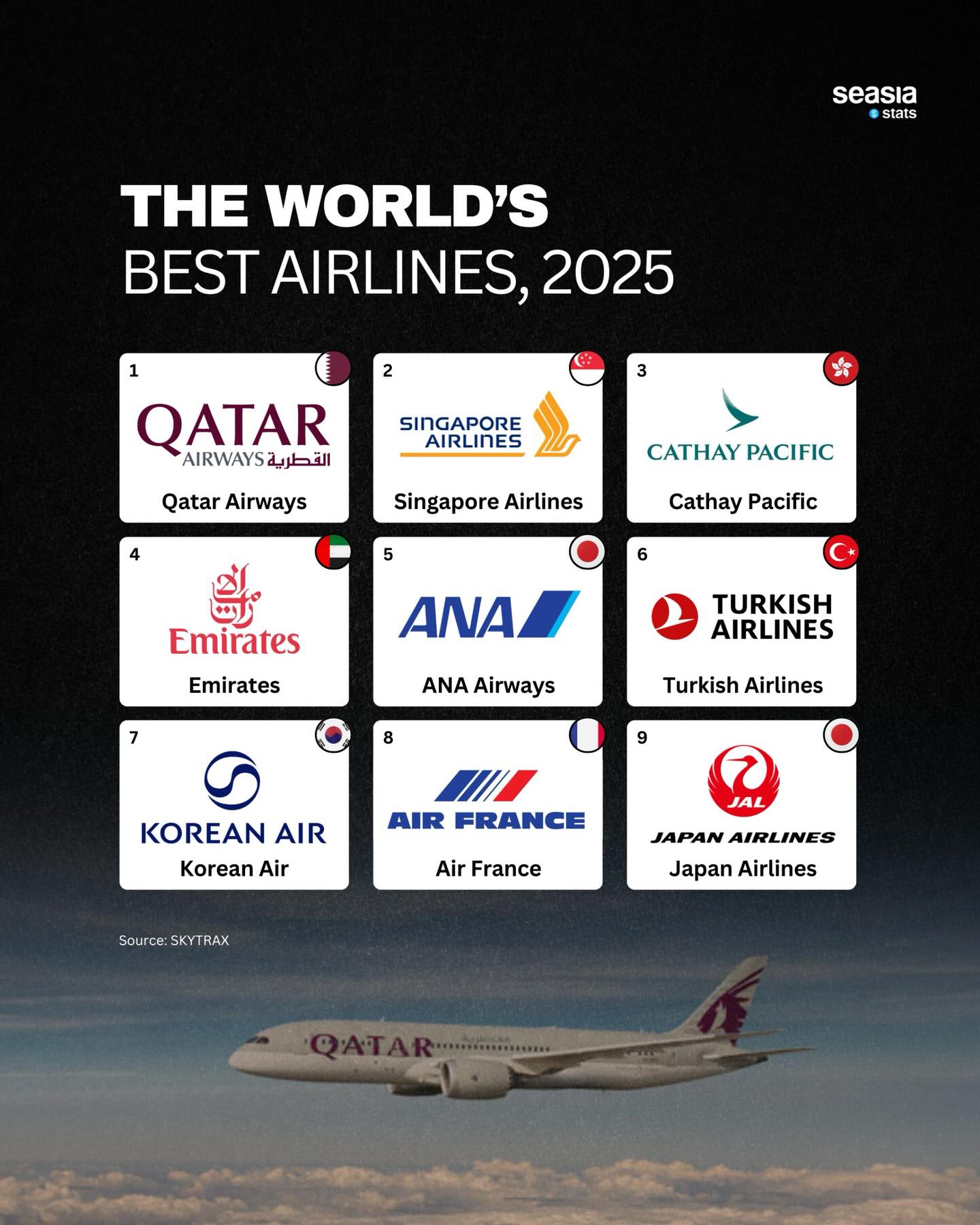 The rest of the top ten reflects strong competition among global carriers, including Emirates, ANA Airways, and Turkish Airlines. However, the dominance of Qatar Airways, Singapore Airlines, and Cathay Pacific at the top highlights how airlines from Asia and the Middle East continue to lead the industry—setting standards that others strive to match in comfort, innovation, and customer satisfaction.