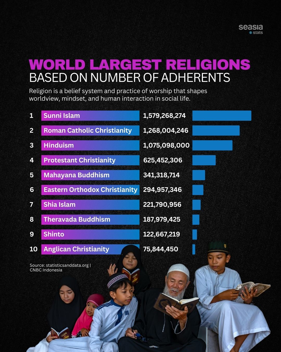 Based on global adherence data, Sunni Islam stands as the world’s largest religious group, with approximately 1.58 billion followers. Spread across the Middle East, Africa, South Asia, and Southeast Asia, Sunni Islam plays a major role in shaping social, cultural, and political life in many regions. Its size reflects centuries of historical expansion and deep-rooted communal traditions.