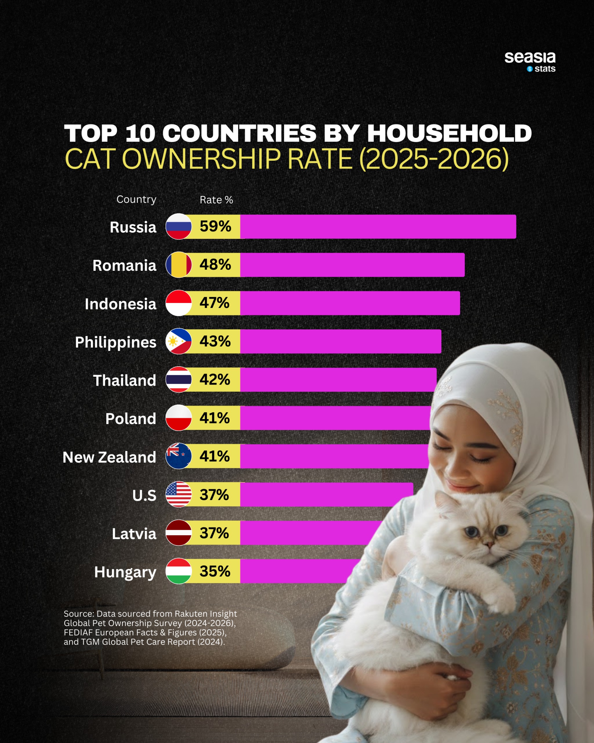 It’s important to distinguish between ownership rates and total numbers. While countries like Russia, the U.S., and China lead in total cat populations, ownership rates are often higher in smaller or more urbanized countries—especially in Southeast Asia and Eastern Europe.