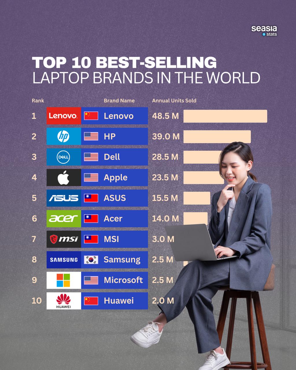 In the middle of the rankings, Taiwanese brands ASUS and Acer demonstrate the strength of Asia’s hardware innovation. ASUS, with 15.5 million units sold, is known for its gaming laptops and sleek ultrabooks, while Acer, at 14.0 million units, is a favorite for affordable yet reliable consumer devices.