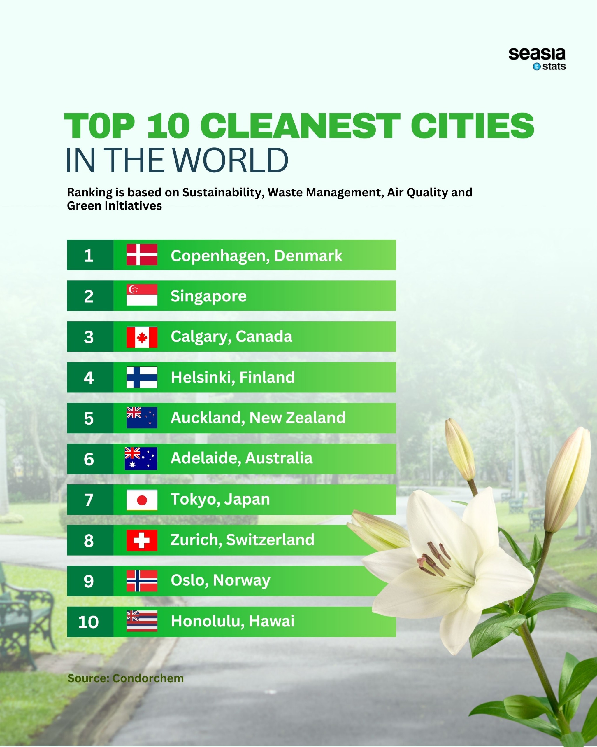 According to data compiled by Condorchem and highlighted by Seasia Stats, a number of cities have emerged as global leaders in urban cleanliness. The ranking evaluates several factors, including sustainability policies, waste management systems, air quality, and environmental initiatives. The results highlight a strong presence from Europe and Oceania, along with a standout city from Southeast Asia.