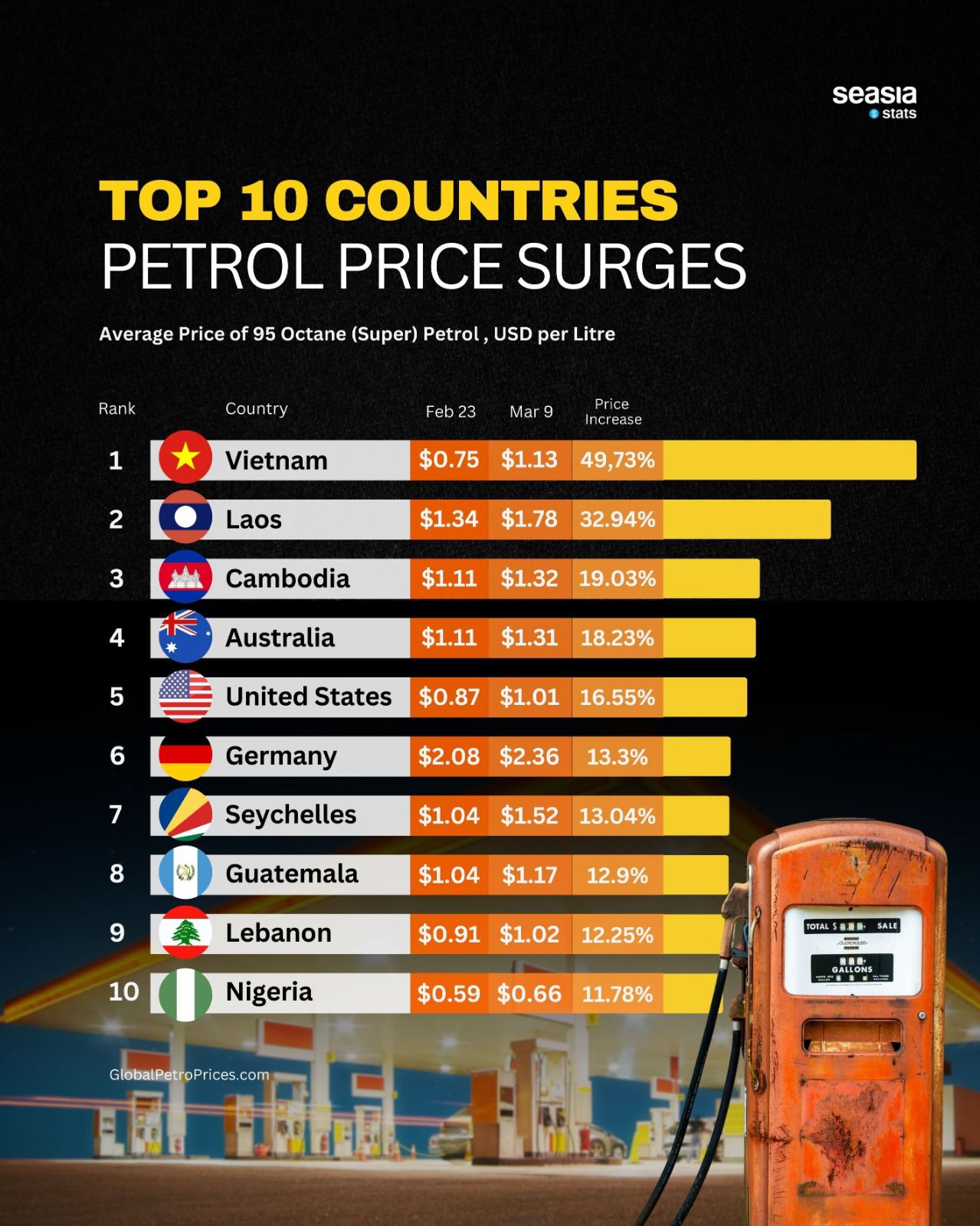 Fuel prices rarely stay a matter of economics alone. Once petrol jumps sharply, it quickly becomes a story about commuting, food inflation, delivery costs, tourism, and public anger. The latest Seasia Stats graphic, based on data from GlobalPetrolPrices.com, captures that pressure in real time: in just over two weeks, several countries saw noticeable spikes in the average price of 95-octane petrol, with Vietnam, Laos, and Cambodia emerging as the most heavily hit in Southeast Asia.