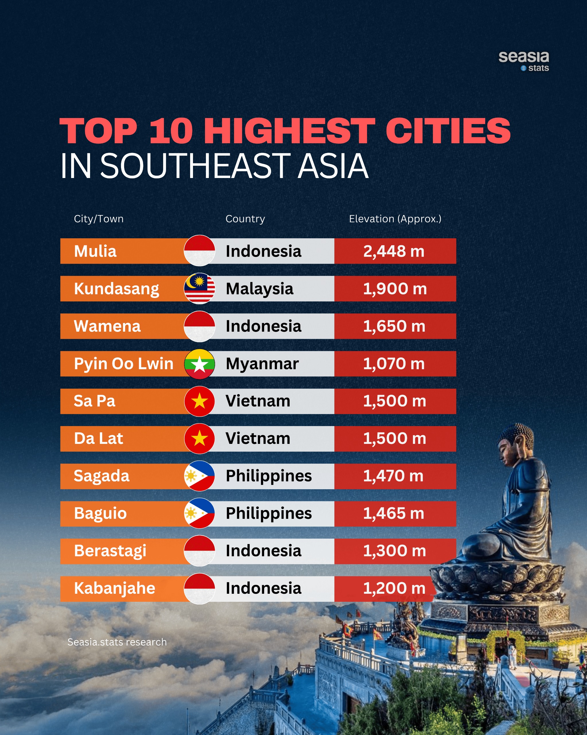 The Philippines also appears strongly with Sagada and Baguio, both perched well above 1,400 meters. Baguio has long been known as the country’s “summer capital,” while Sagada is associated with pine forests, caves, rice terraces, and a slower, cooler rhythm of life. These places matter because they show how elevation in Southeast Asia is not just a physical fact—it is a social and cultural distinction. Highland towns often develop different cuisines, crops, clothing needs, and tourism patterns than the lowland capitals.