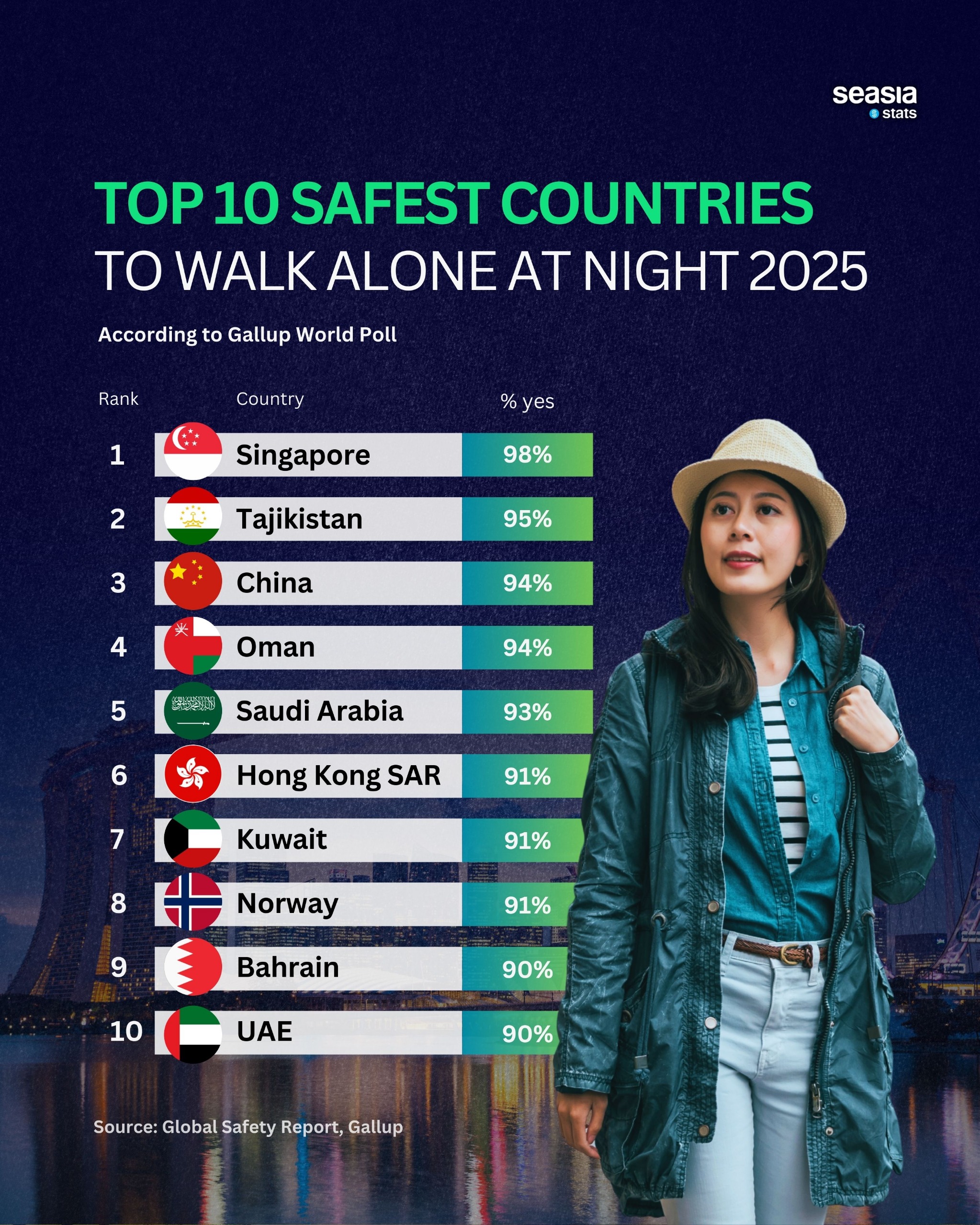 At the very top of the rankings stands Singapore, where an extraordinary 98% of respondents say they feel safe walking alone at night. This is not just a statistic; it reflects decades of consistent policy, urban planning, and social trust. Low crime rates, strict law enforcement, and efficient public infrastructure have combined to make Singapore one of the safest urban environments in the world.