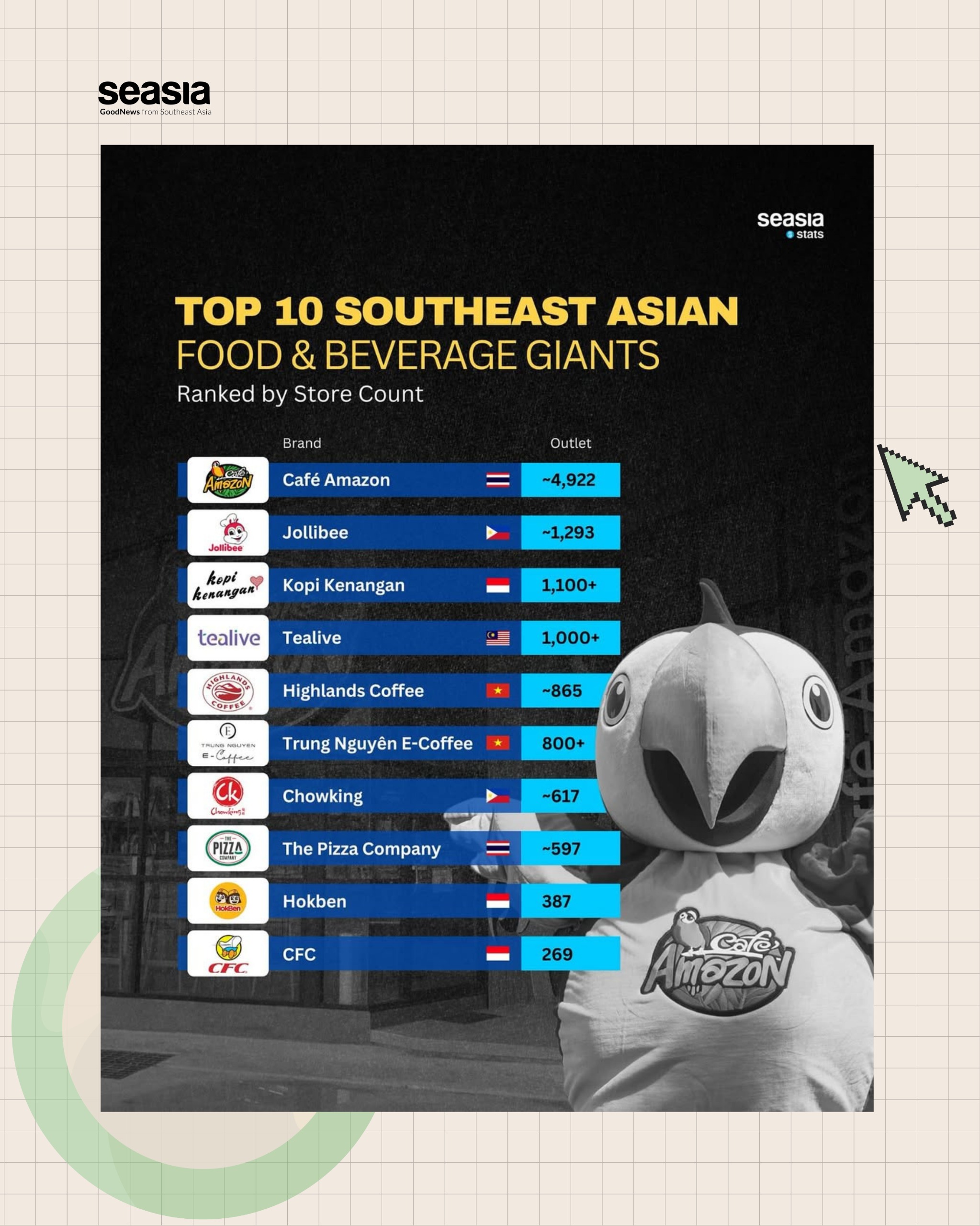 At the very top of the regional leaderboard stands Café Amazon, Thailand’s dominant coffee chain with approximately 4,922 outlets. Built by energy conglomerate PTT, the brand’s growth has been closely tied to the country’s highway and petrol station network, making it a familiar stop for commuters and travelers alike. Its rapid expansion into Cambodia, Laos, Vietnam, and even the Middle East reflects a broader ambition: turning a local coffee stop into a global lifestyle brand.