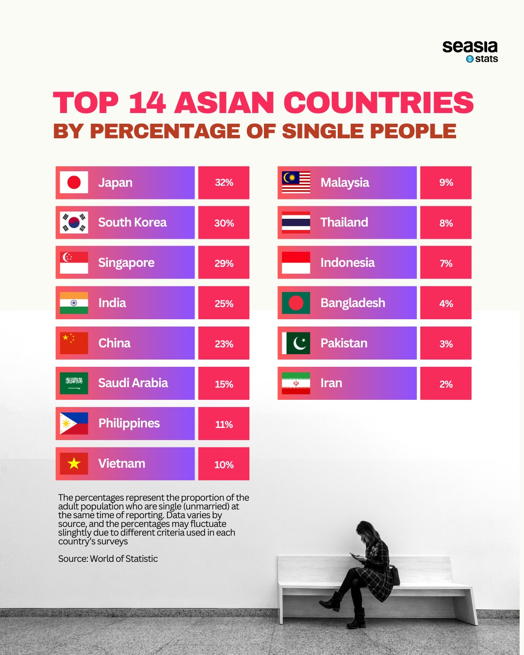 The percentages listed represent the proportion of the adult population that is single (unmarried) at the time of reporting. These figures may vary across different sources due to discrepancies in survey methodologies, definitions of "single," and criteria used in each country's data collection processes. Readers are advised to interpret the data with these considerations in mind.