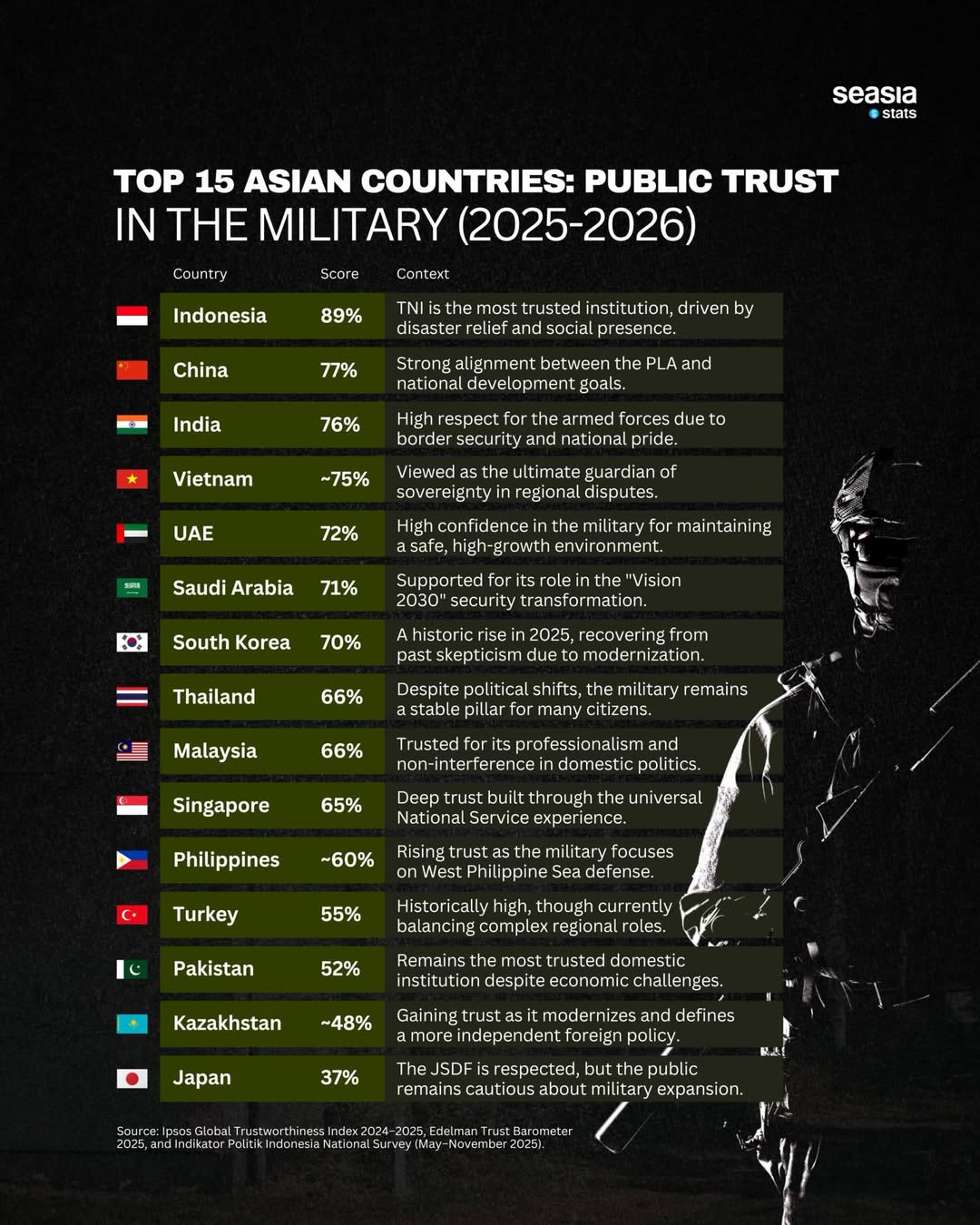 Public trust in the military across Asia in 2025–2026 shows clear regional contrasts, with several countries placing exceptionally high confidence in their armed forces. Leading the ranking is Indonesia, which tops the list with an impressive 89% trust score.