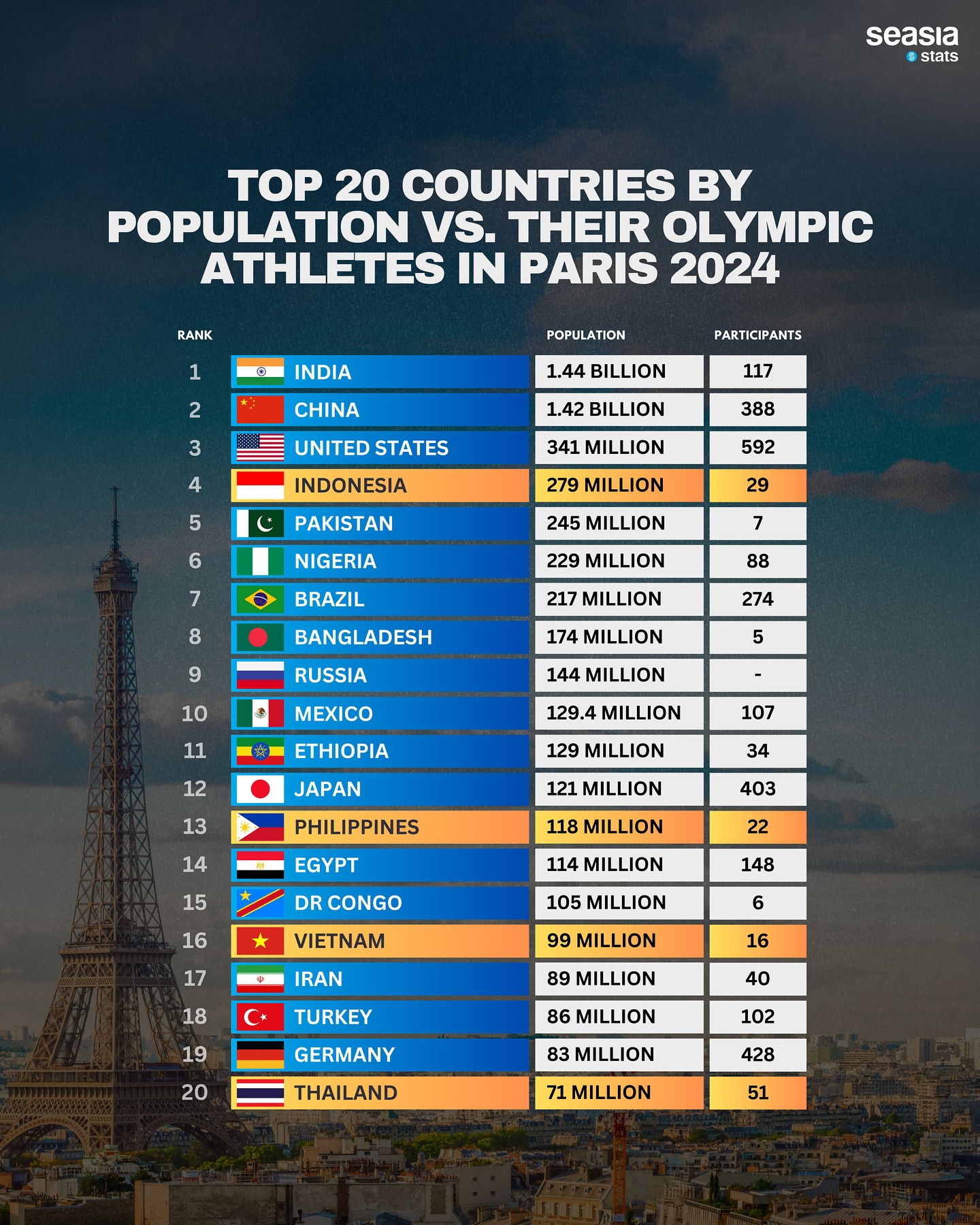 Indonesia's representation is lower compared to its population size, indicating a potential area for growth in Olympic sports.
