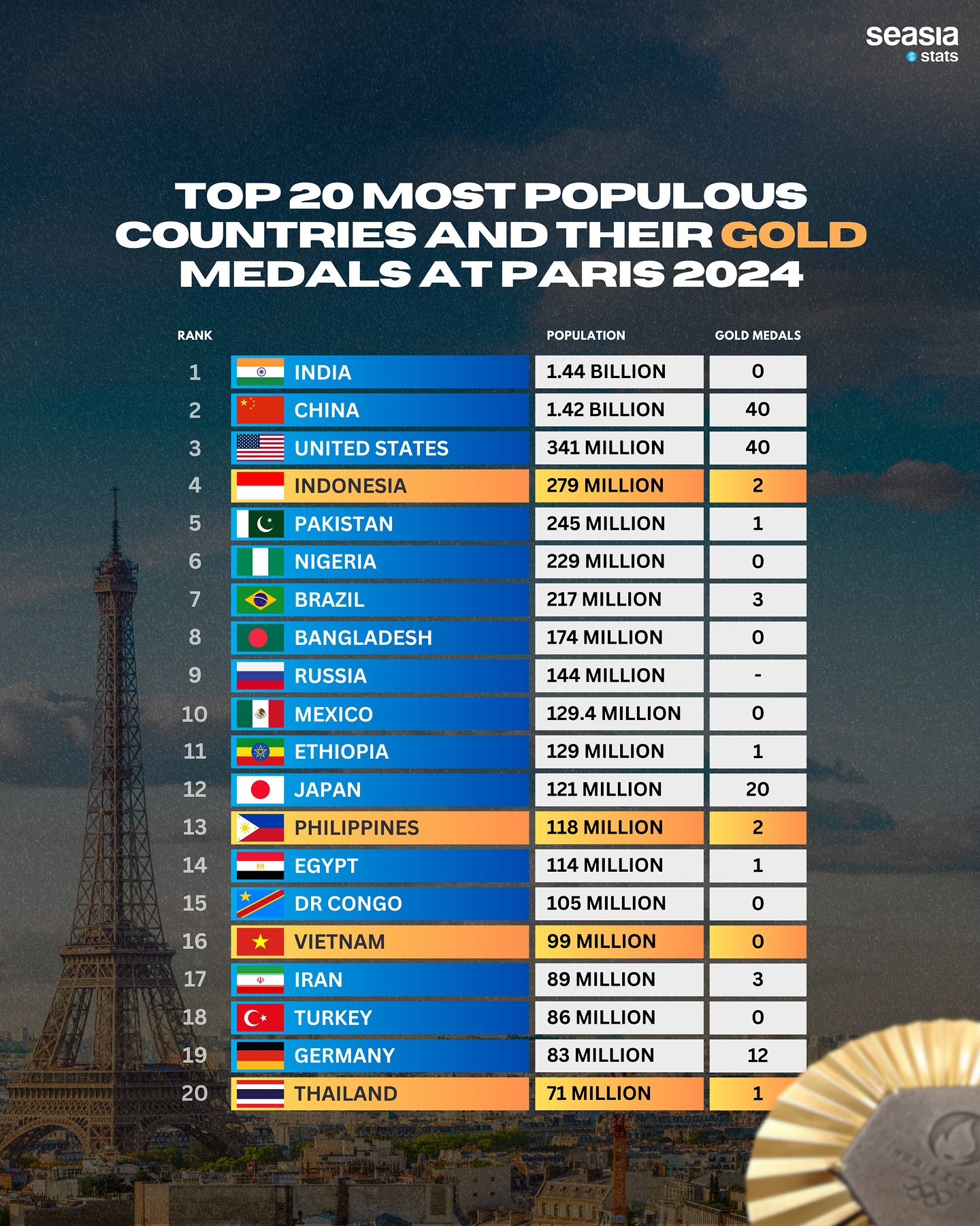 The Paris 2024 Olympics have concluded, showcasing a spectacular array of athletic talent from around the globe. Among the competing nations, the most populous countries were particularly in the spotlight, each aiming to secure as many gold medals as possible. Here's a detailed look at how the top 20 most populous countries fared in terms of population and gold medals won at the Paris 2024 Olympics.
