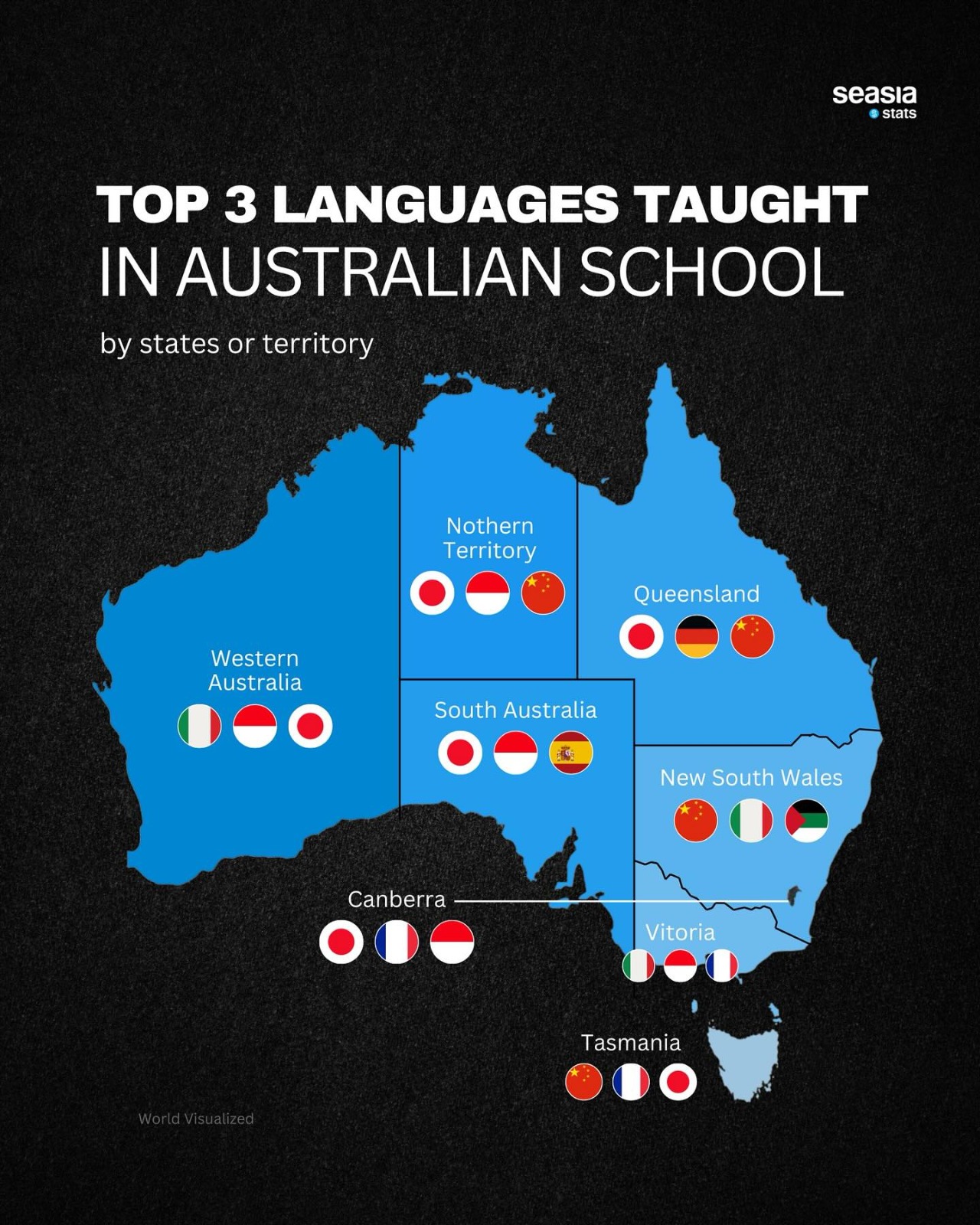 Victoria and South Australia show a balanced mix of European and Asian influences. Italian and French remain popular, especially in Melbourne and Adelaide where European heritage communities remain strong. Yet Indonesian and Japanese continue to grow as students prepare for careers in Asia-Pacific industries.