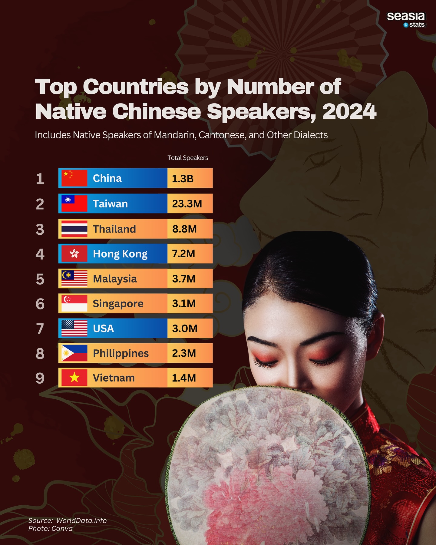 According to WorldData.info, last updated in July 2024, Thailand is the country with the highest number of native Mandarin speakers in Southeast Asia. This includes Mandarin, Cantonese, and other dialects. The term “Chinese” refers to a group of related languages or dialects spoken primarily by the Han people, the largest ethnic group in China, originating from Greater China.