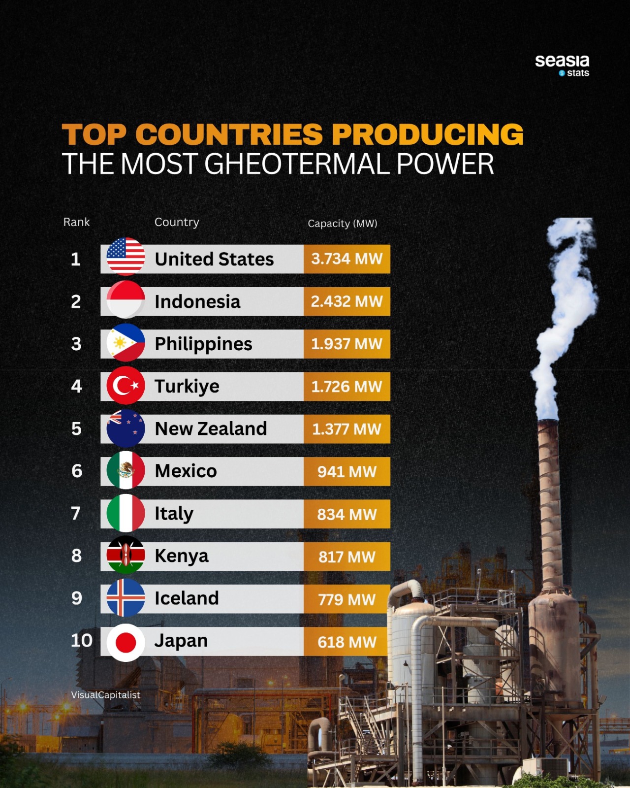 According to the infographic from Seasia Stats and Visual Capitalist, the United States remains the world’s largest geothermal power producer with 3,734 MW of installed capacity. But the most striking story is what comes next: Indonesia in second place with 2,432 MW, and the Philippines in third with 1,937 MW.