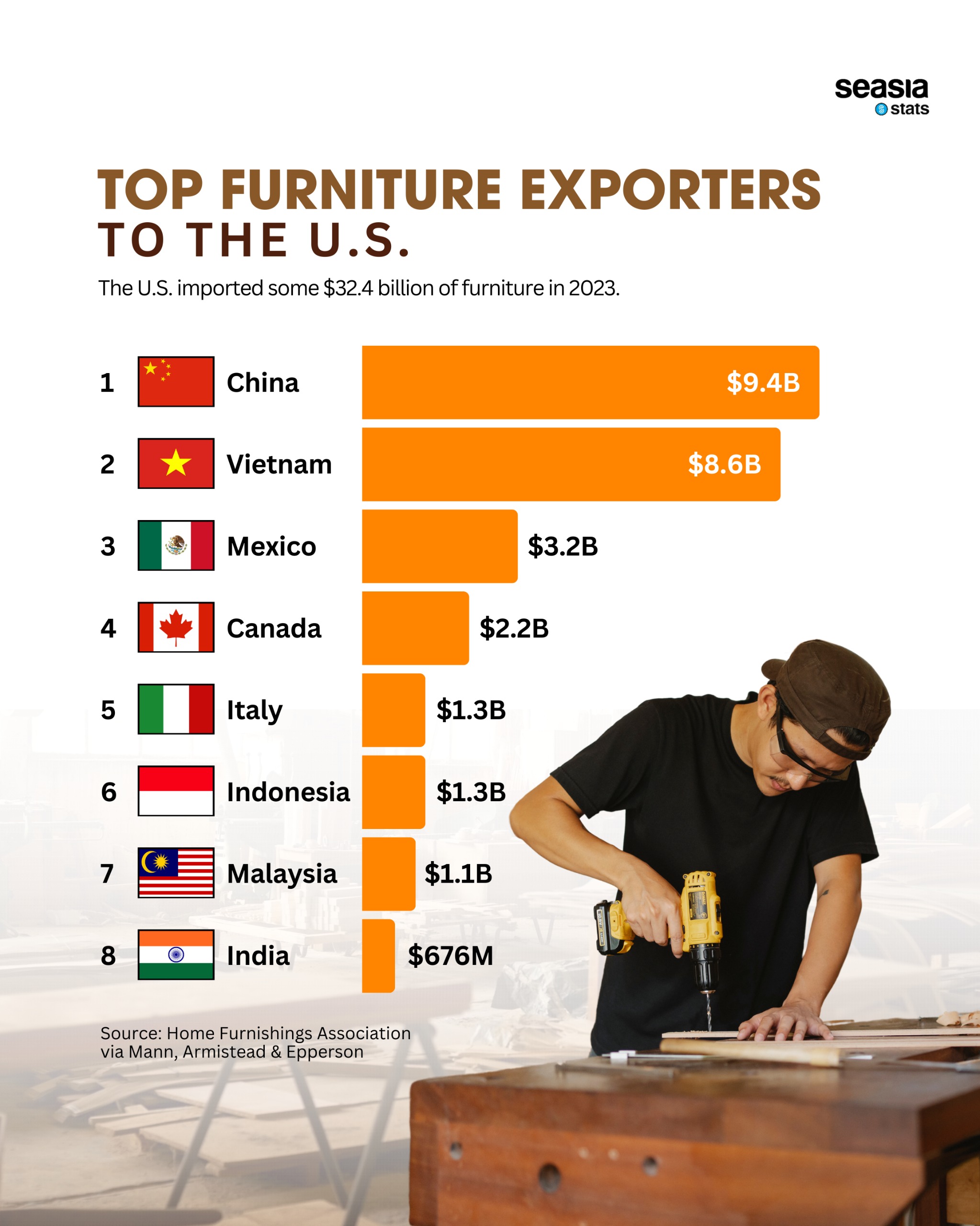 China continues to be the largest furniture exporter to the U.S., contributing $9.4 billion in 2023. Despite increasing competition and shifting global supply chains, China remains dominant in this sector.