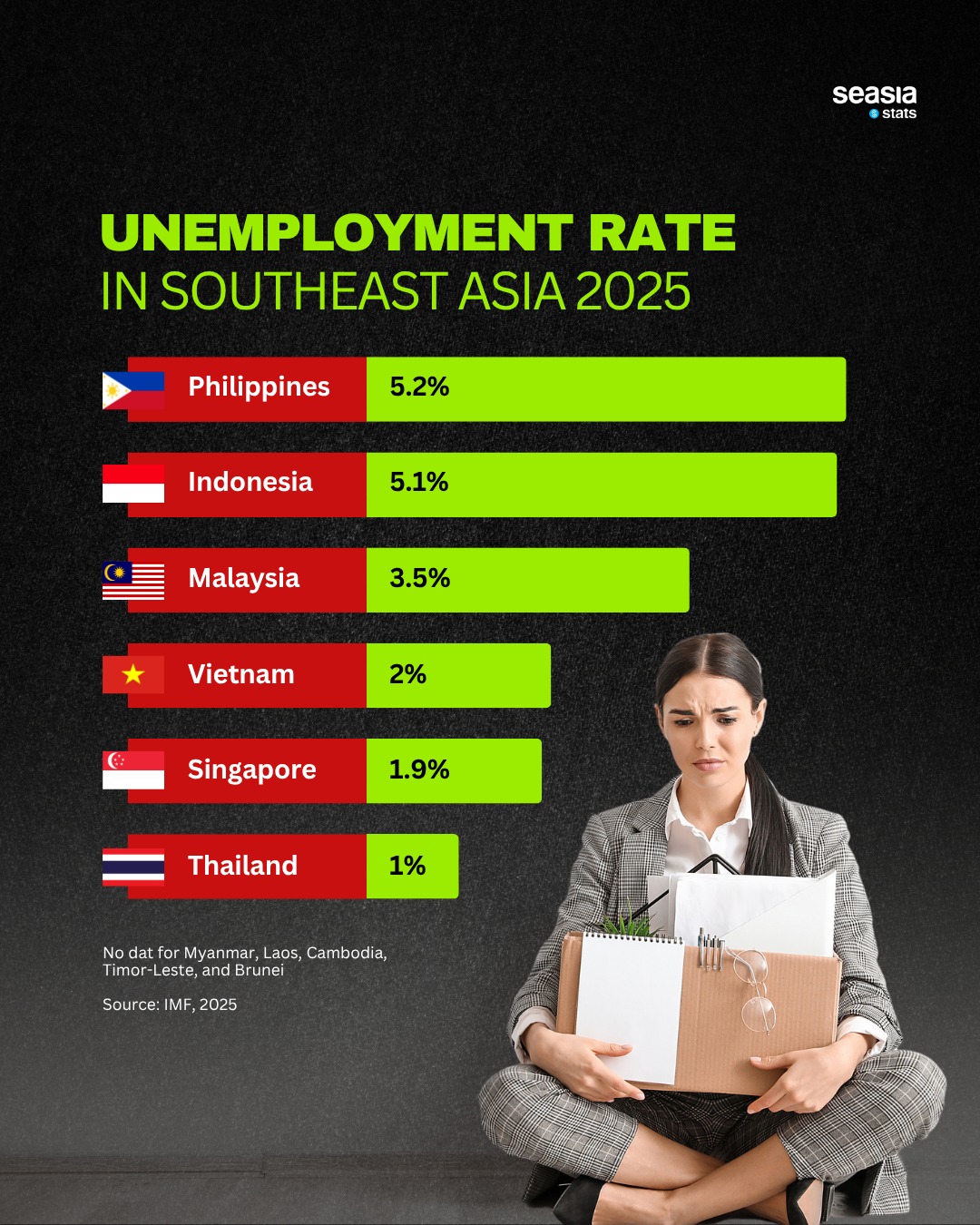 At the top of the unemployment list, the Philippines reports a 5.2% unemployment rate, the highest in the region. Indonesia follows closely at 5.1%, indicating that both countries — Southeast Asia’s most populous — are still navigating structural job market issues, such as underemployment, youth job gaps, and skills mismatches.