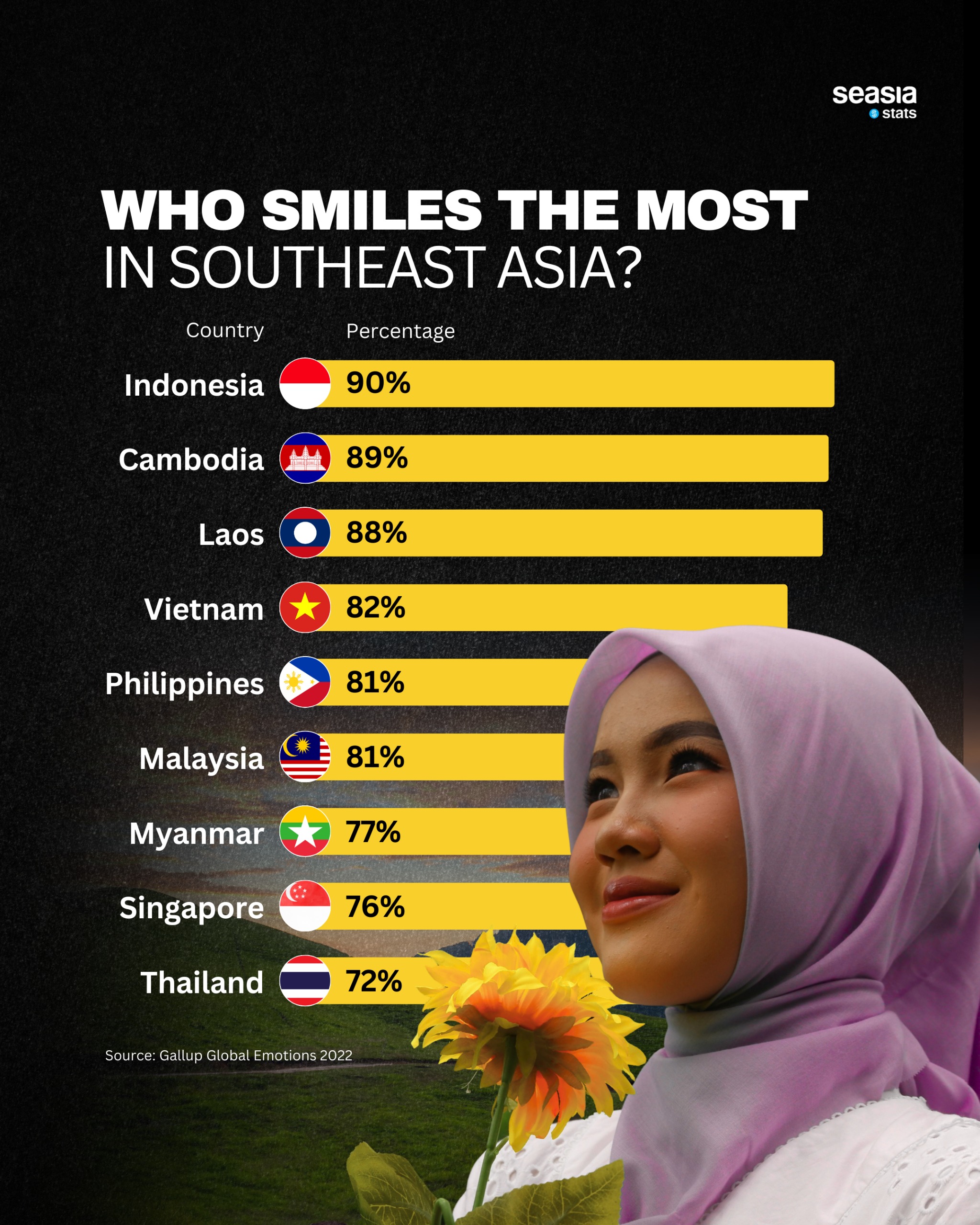 In Southeast Asia, a smile is more than a facial expression—it’s a social language, a cultural reflex, and often a quiet form of resilience. According to the Gallup Global Emotions 2022 report, visualized by Seasia Stats, people across the region rank among the world’s most frequent smilers. From bustling megacities to rural villages, everyday joy remains remarkably visible, even amid economic and political challenges.