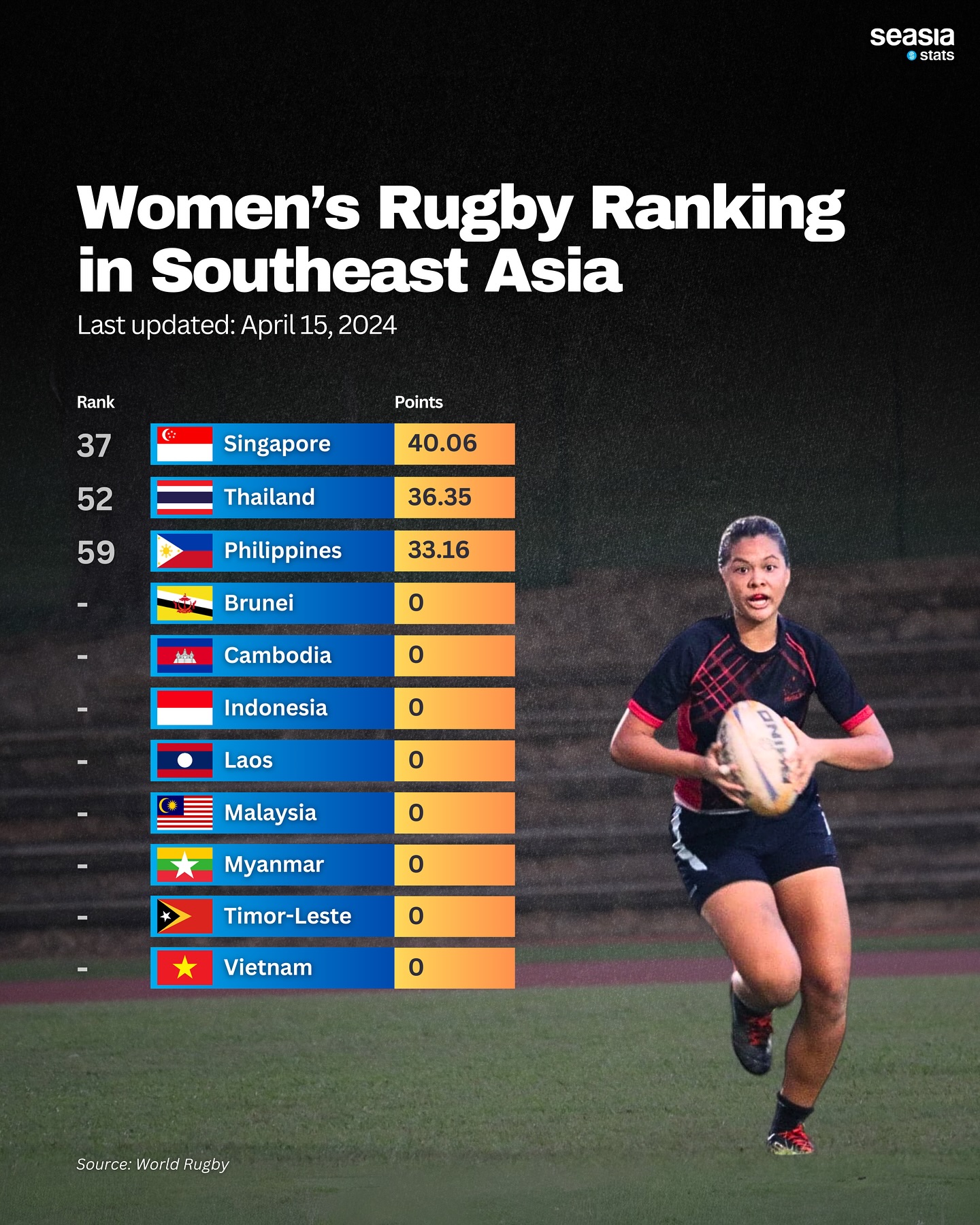 According to official World Rugby website in the 15 April 2024 update, Singapore ranks first in Southeast Asia with a global ranking of 37, followed by Thailand in second place with a ranking of 52, and Philippines in ranking of 59.