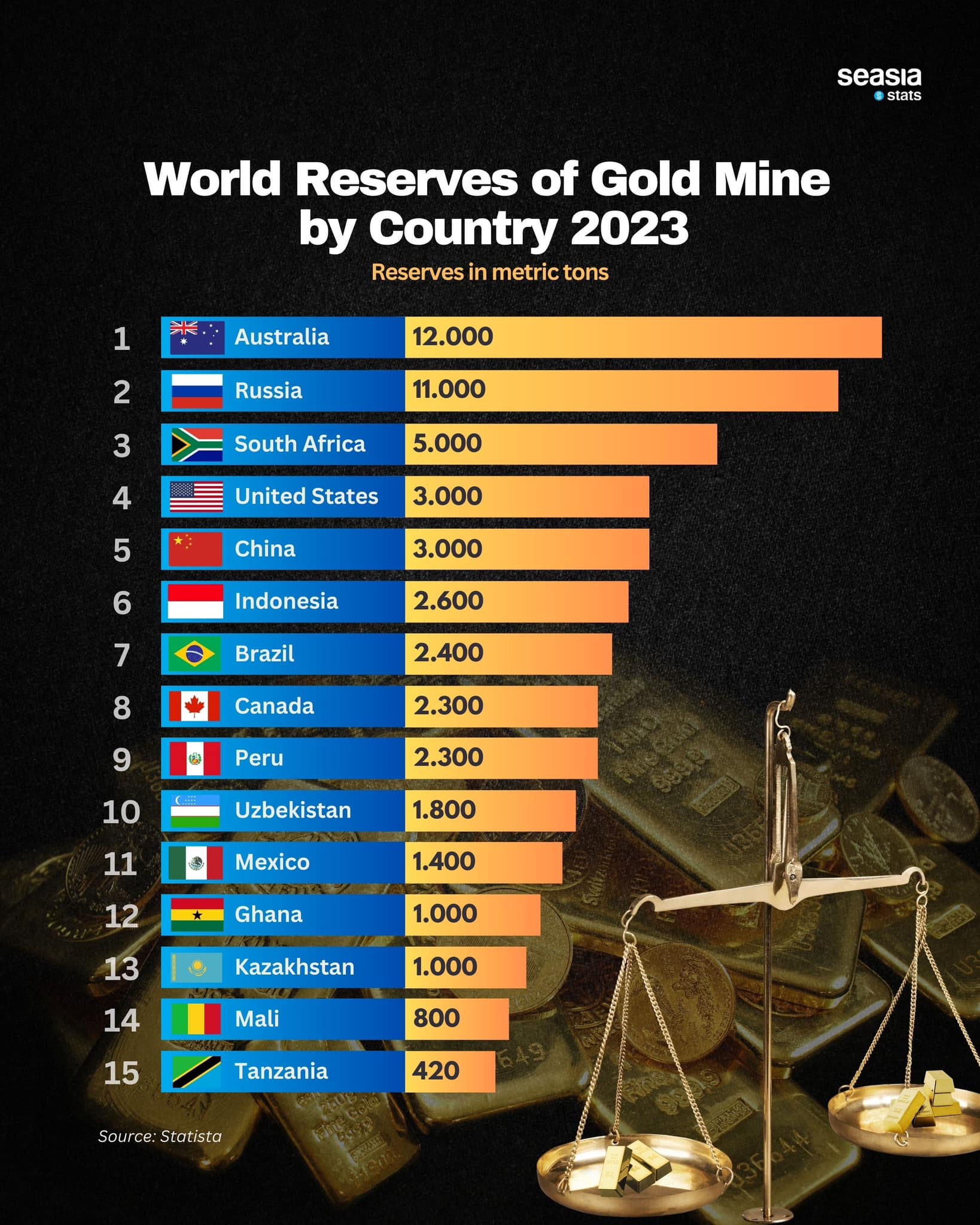 Indonesia ranks sixth globally, with 2,600 metric tons of gold reserves. The country’s gold mining industry is primarily centered around the Grasberg Mine in Papua, one of the largest gold mines in the world. Indonesia’s gold industry has been growing steadily, supported by both foreign and domestic investments. The country’s geographical location within the Pacific Ring of Fire makes it rich in mineral resources, and gold continues to be one of its most valuable exports.