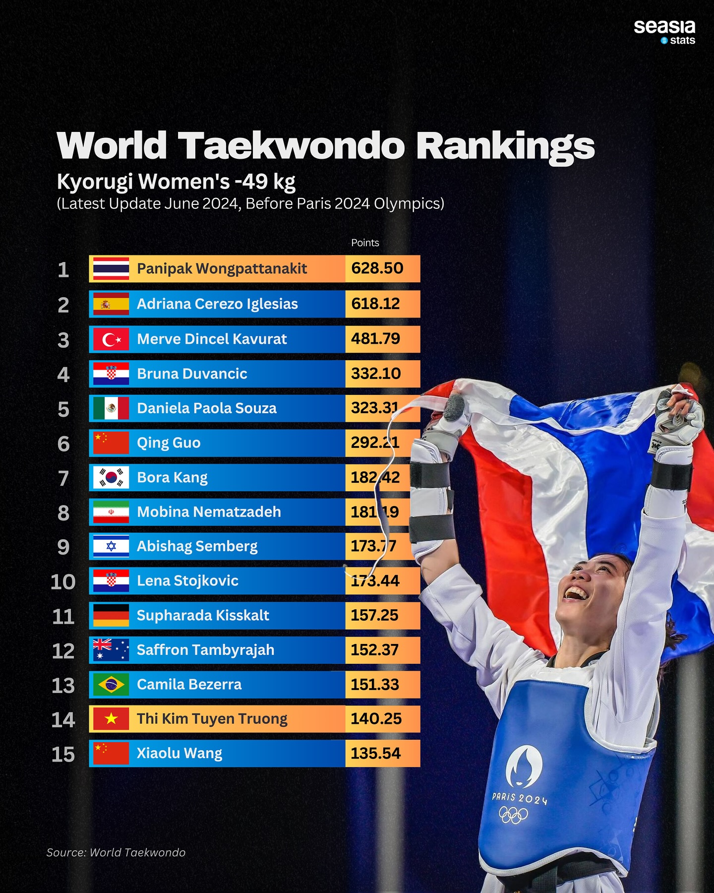 The rankings highlight the global talent pool in the Kyorugi Women’s -49 kg category, with Panipak Wongpattanakit continuing to stand out as a dominant force. Her consistent performance underscores her position as a leading contender for the upcoming Olympics in Paris.