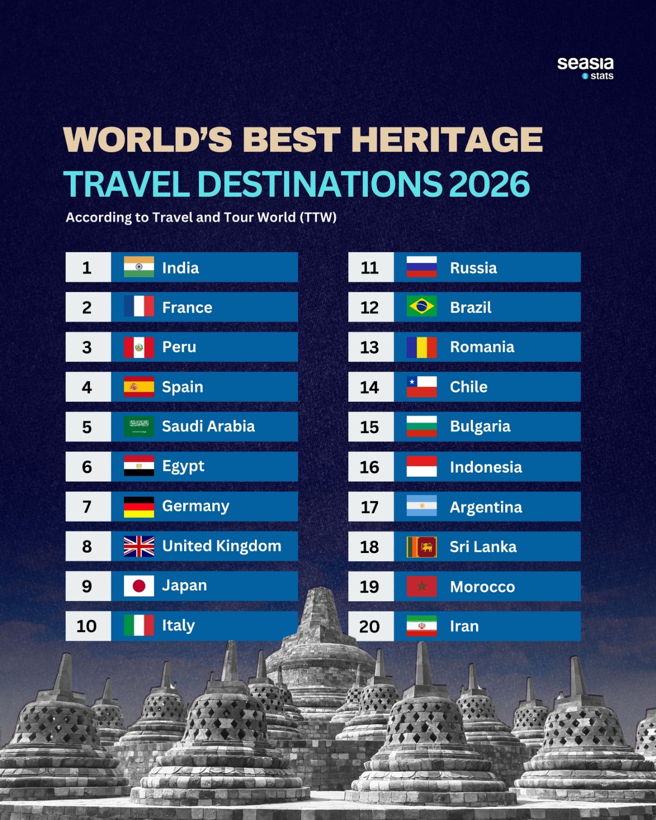 Travel in 2026 is no longer just about ticking destinations off a list. It is about meaning—about walking through places where history still breathes, where culture is layered, and where identity is preserved in stone, ritual, and memory. The latest ranking highlighted by Seasia Stats, based on Travel and Tour World (TTW), reflects this growing shift toward heritage-driven travel, placing India at the very top of the global stage.
