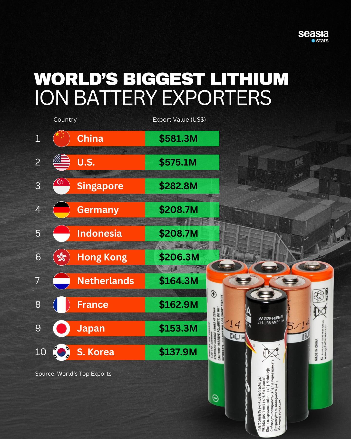 The global lithium-ion battery market continues to expand rapidly in 2025, with China, the United States, and Singapore emerging as the world’s top three exporters. China leads with an export value of $581.3 million, strengthened by its massive manufacturing capacity and dominance in the battery supply chain. The U.S. follows closely at $575.1 million, driven by its growing electric vehicle industry and renewed investments in domestic battery production.