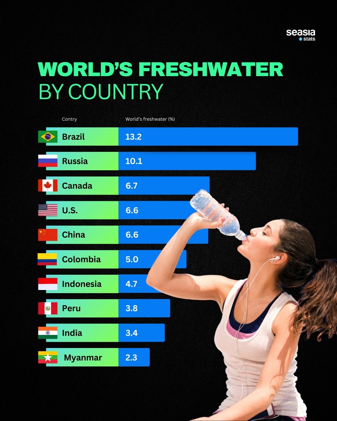 When it comes to freshwater, not all countries are created equal. Some nations are blessed with an abundance of lakes, rivers, and rainforests — and Brazil leads them all, holding a massive 13.2% of the world’s freshwater supply. Much of it comes from the Amazon Basin, a natural water engine unlike anything else on Earth. Russia comes next with 10.1%, largely thanks to the legendary Lake Baikal and a vast northern wilderness filled with icy rivers and deep lakes.