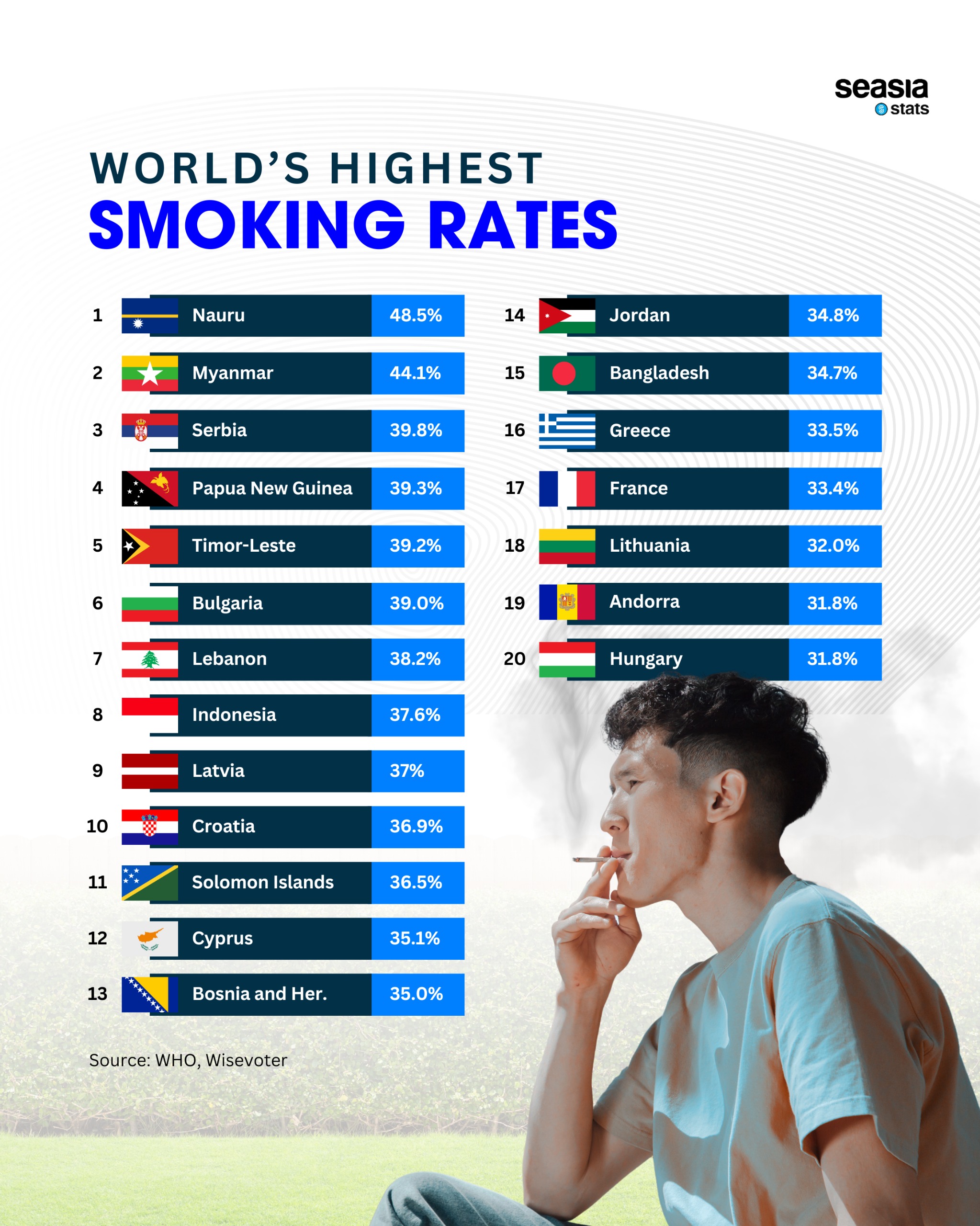 These statistics highlight the ongoing challenge of tobacco control worldwide. While many countries have implemented strict anti-smoking policies, cultural and economic factors continue to fuel high smoking rates. Addressing this issue requires stronger public health campaigns, taxation, and smoking cessation programs to reduce the long-term health risks associated with tobacco use.