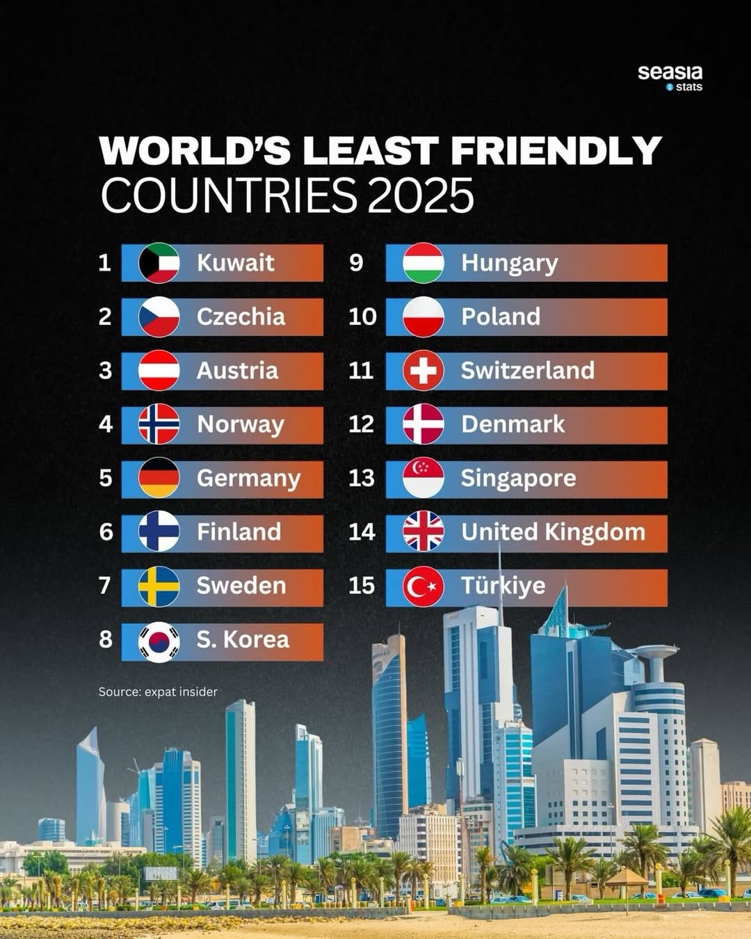 The latest Expat Insider 2025 ranking reveals the world’s least friendly countries for foreigners, with Kuwait once again taking the top spot. Expats cite challenges in making local friends, difficulties integrating into the culture, and a generally unwelcoming social environment.