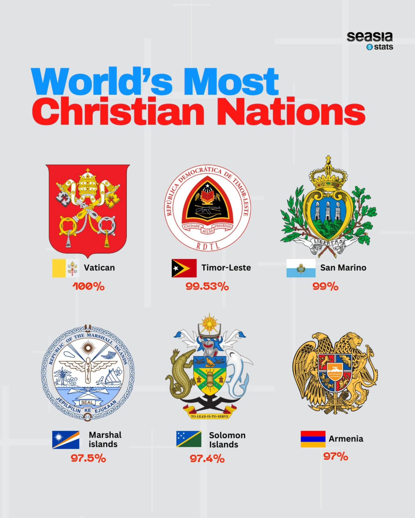In Southeast Asia, Timor-Leste emerges as a significant Christian stronghold. With 99.53% of its population identifying as Christian, the country reflects the legacy of Portuguese colonization and missionary activity, which introduced Catholicism to the region. Today, Christianity deeply influences the nation's culture, festivals, and societal norms, making it a notable example of the faith's reach beyond traditionally Western regions.