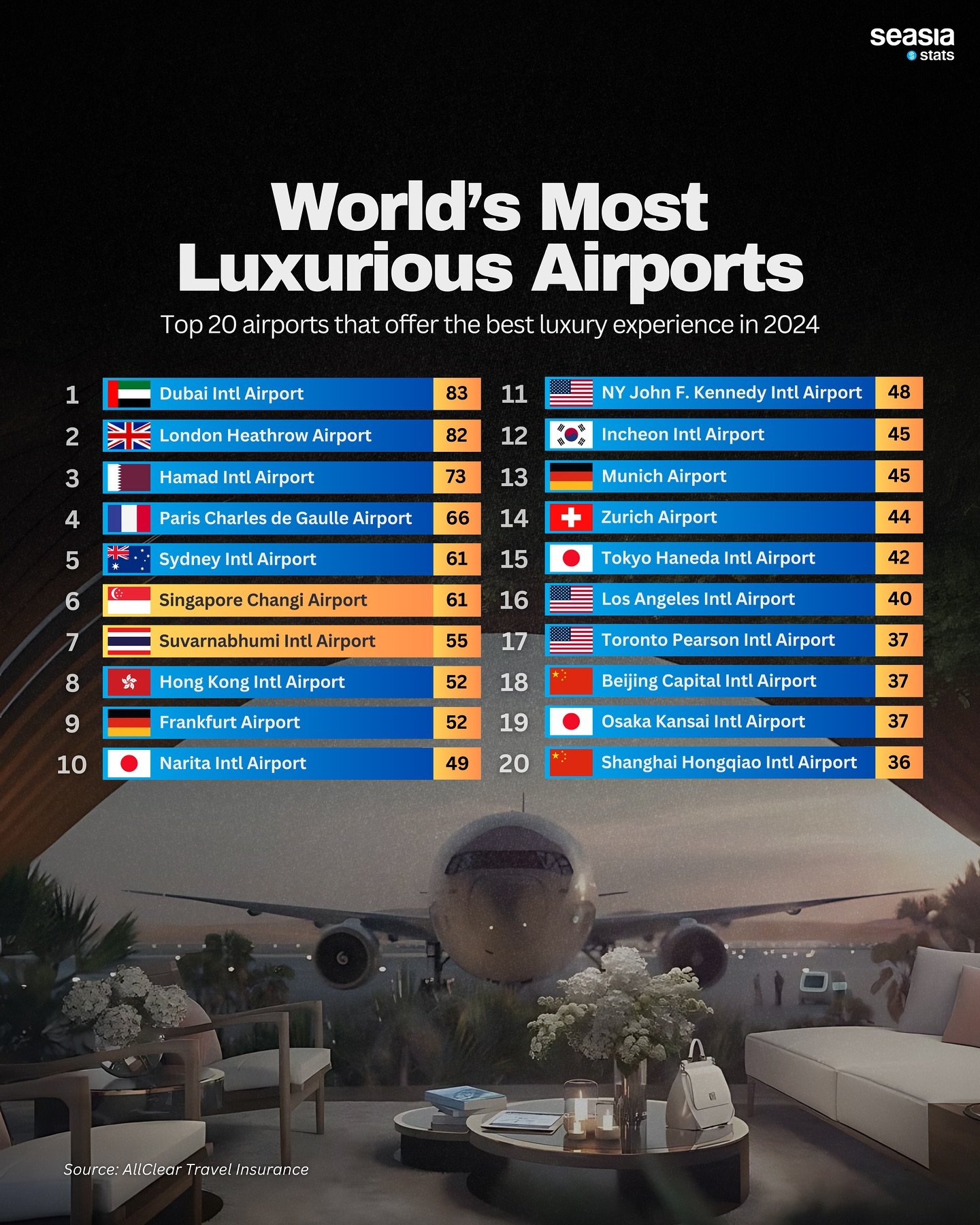 Singapore Changi Airport and Suvarnabhumi Intl Airport are among the top 20 most luxurious airports in the world in 2024!