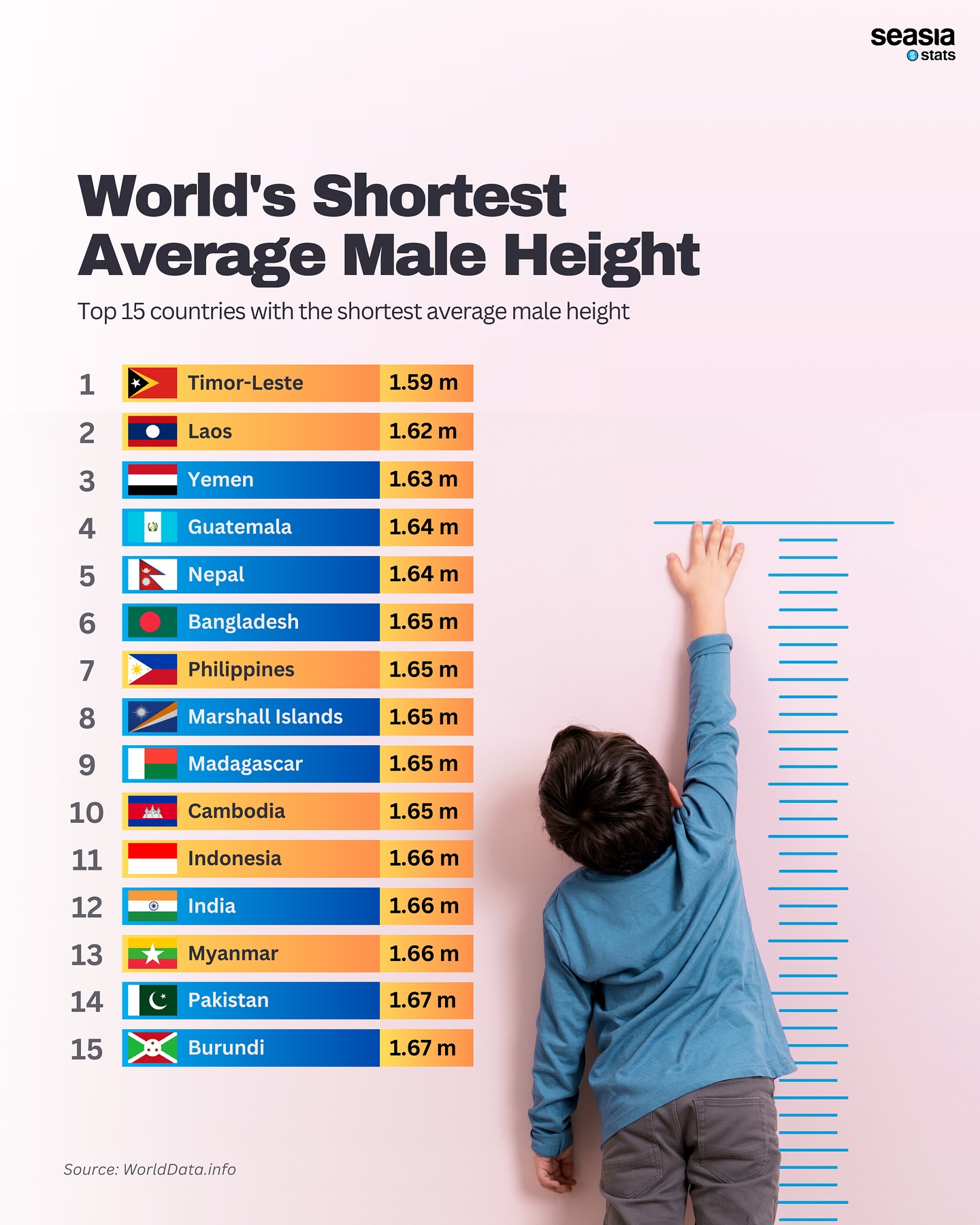 According to WorldData.info, which tracks average heights for men aged 18 to 25 across 126 countries, Timor-Leste has the shortest average male height in the world, with men averaging 1.59 meters. Laos follows closely with an average male height of 1.62 meters. Other Southeast Asian countries also feature prominently on the list, with the Philippines and Cambodia both having an average male height of 1.65 meters, while Indonesia and Myanmar are slightly taller at 1.66 meters. This highlights a regional trend where several Southeast Asian nations have shorter average male heights compared to the global average.
